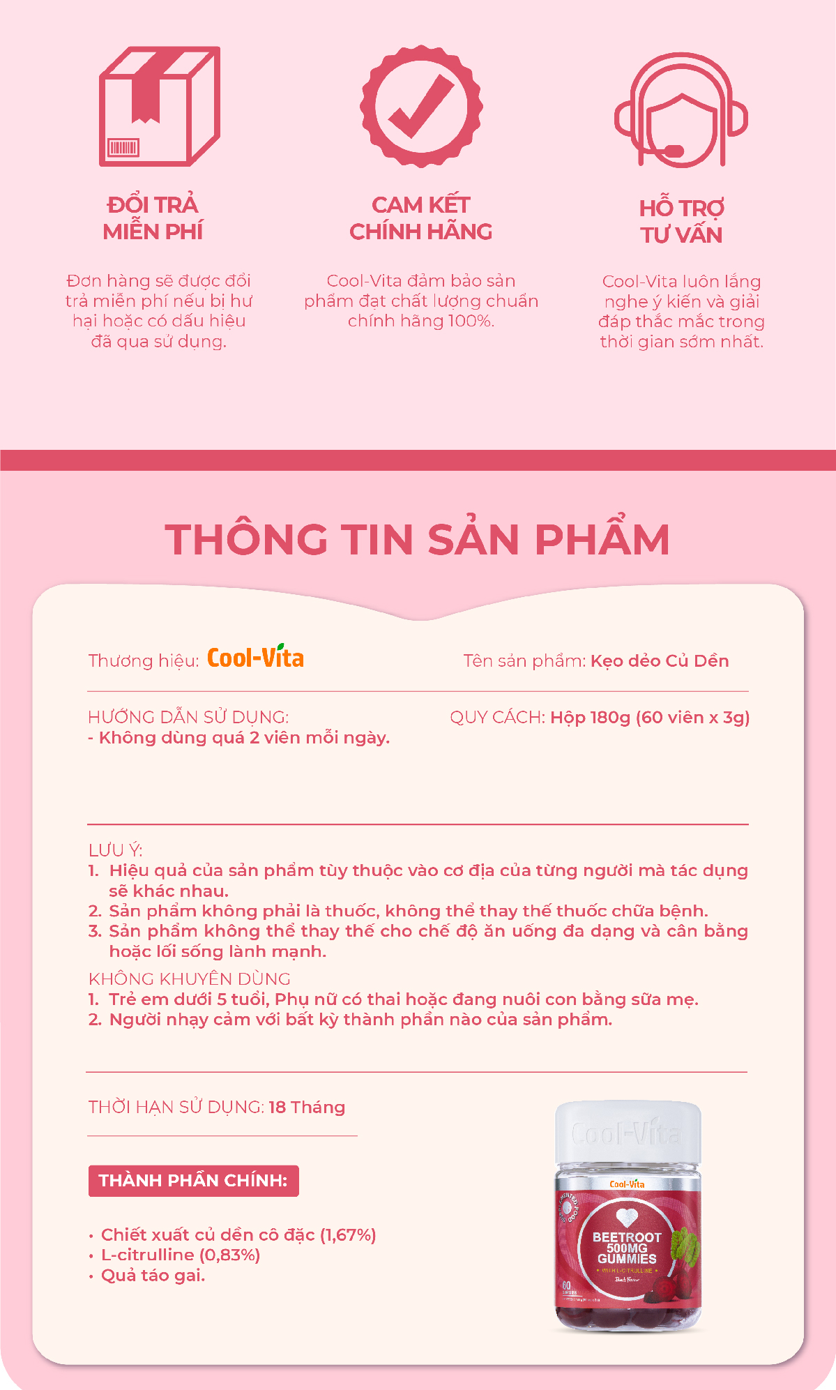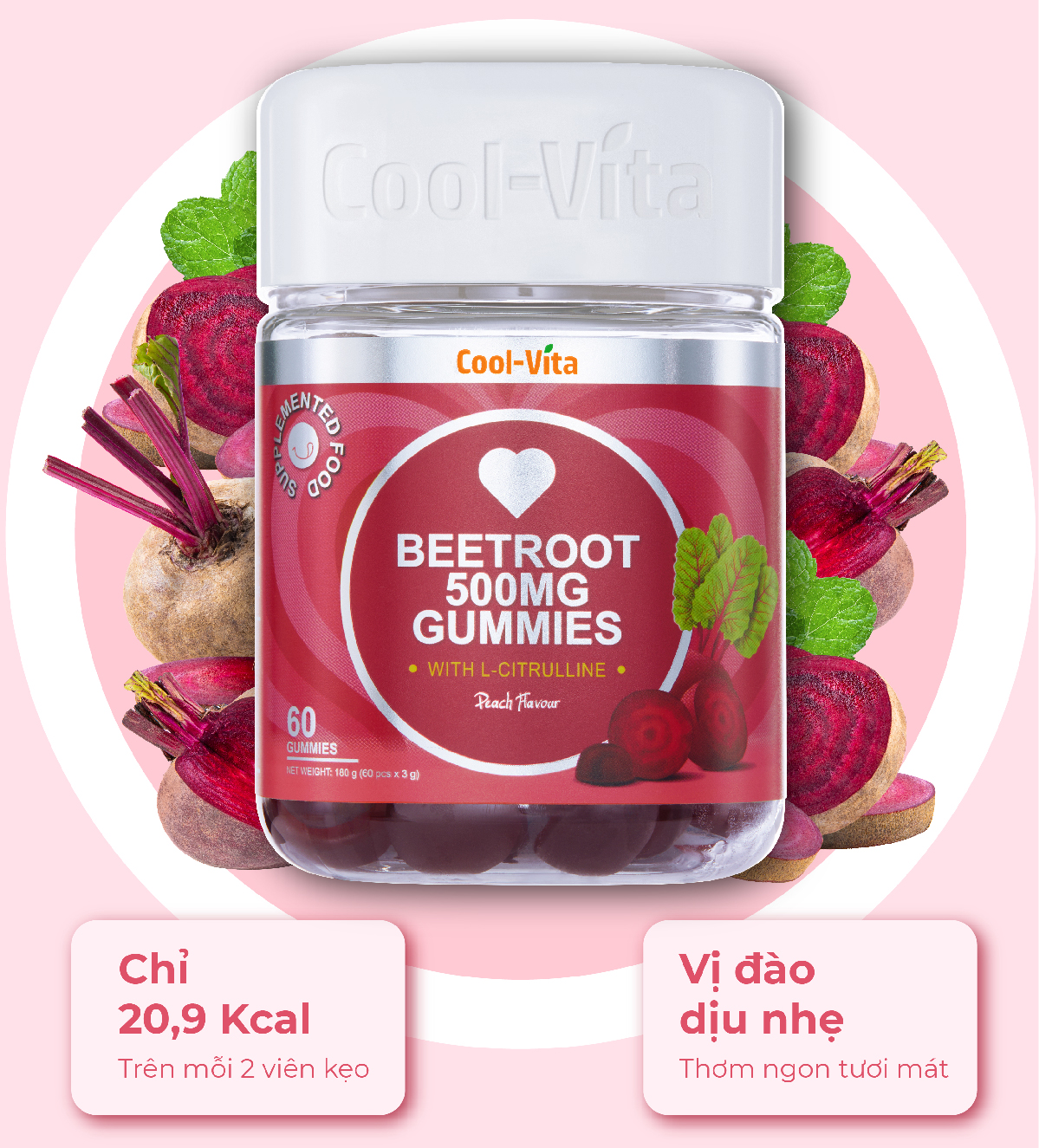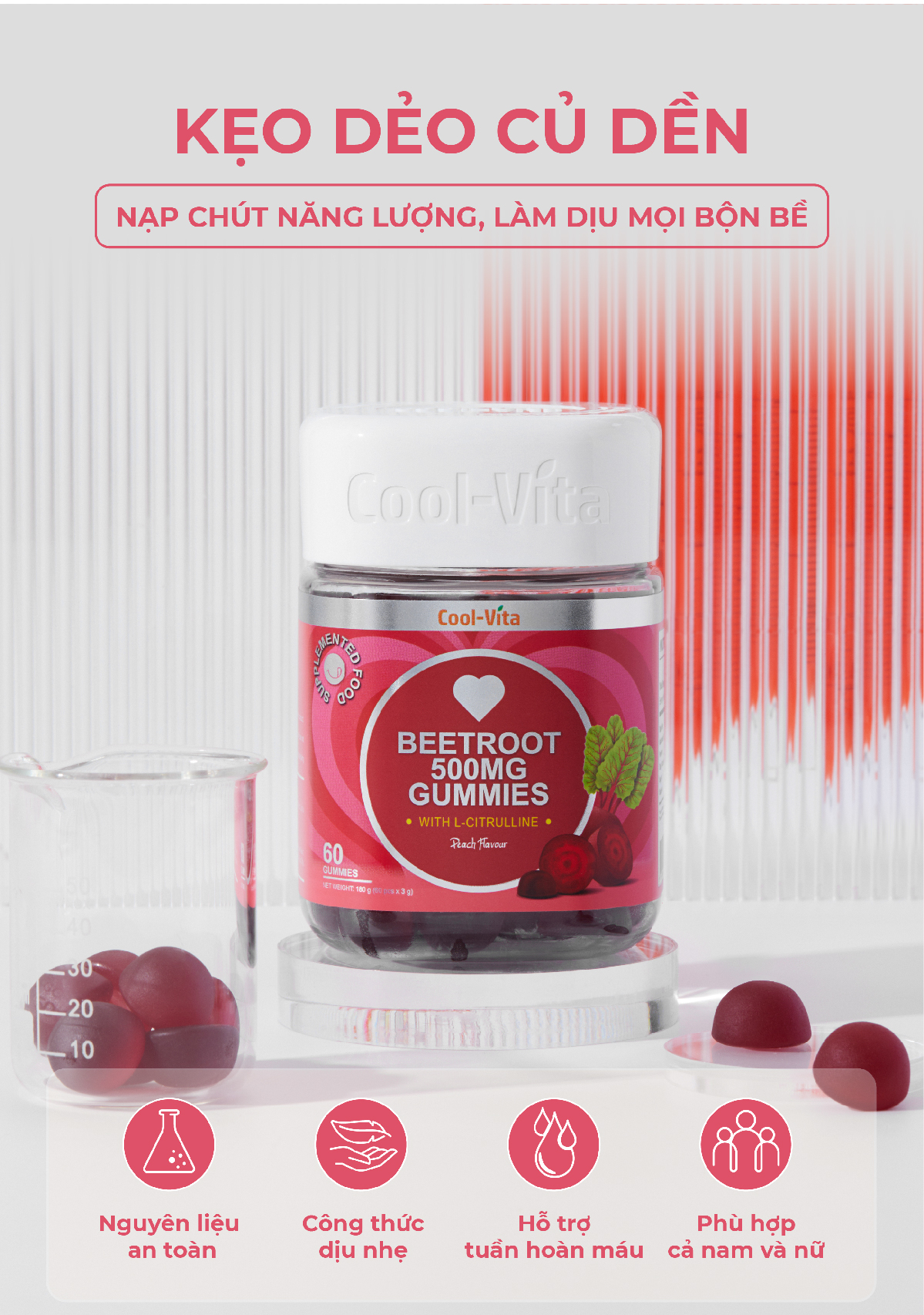 Kẹo dẻo củ dền CoolVita với 500mg chiết xuất củ dền trong mỗi 2 viên kẹo, kết hợp cùng L-Citrulline là sự lựa chọn hoàn hảo hỗ trợ bạn duy trì sức bền dẻo dai, hỗ trợ cải thiện sức khỏe tim mạch và hỗ trợ tăng cường khả năng vận động. Với thành phần chính là chiết xuất củ dền và L-Citrulline, Kẹo Dẻo Củ Dền CoolVita hỗ trợ bạn đạt được thể trạng tốt hơn, hỗ trợ tăng cường khả năng chịu đựng và hỗ trợ phục hồi nhanh chóng sau khi tập luyện. Kẹo Dẻo Củ Dền CoolVita có vị ngọt tự nhiên, thơm vị đào, sẽ là một sản phẩm không thể bỏ qua nếu như bạn là người yêu thích một chế độ dinh dưỡng lành mạnh và có hương vị thơm ngon.