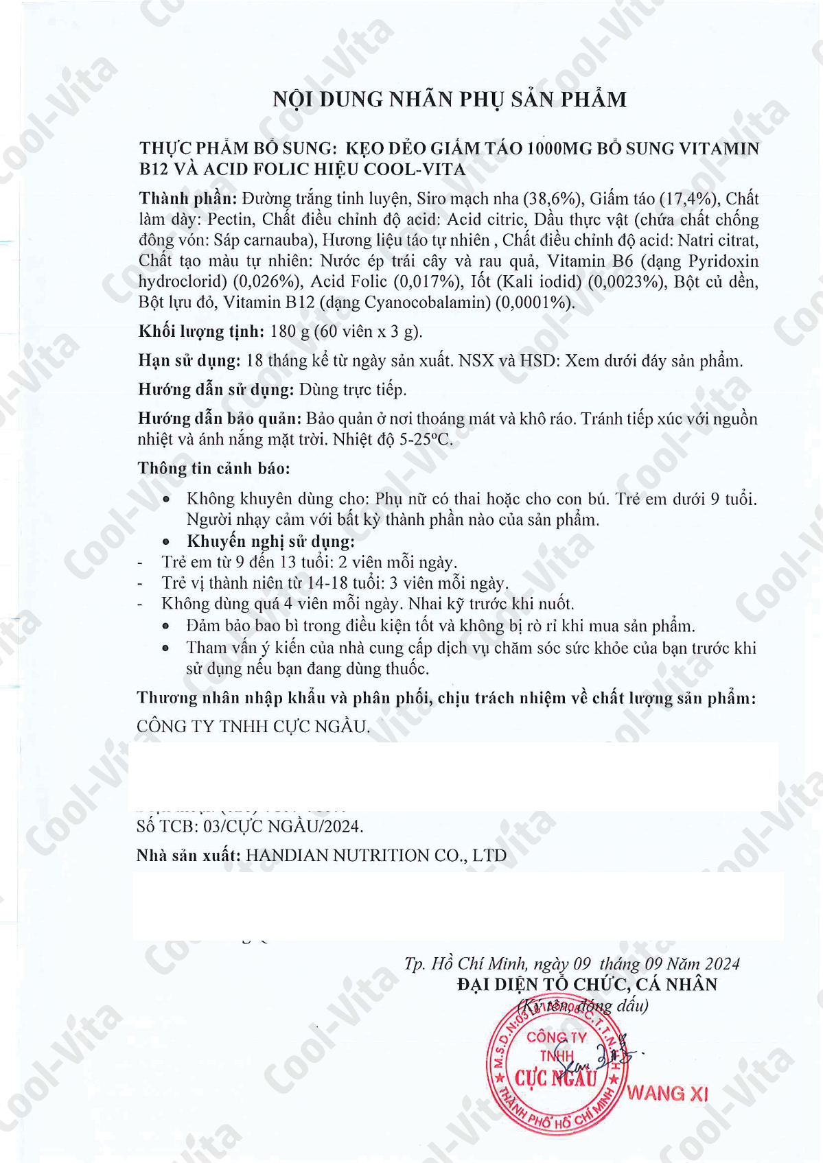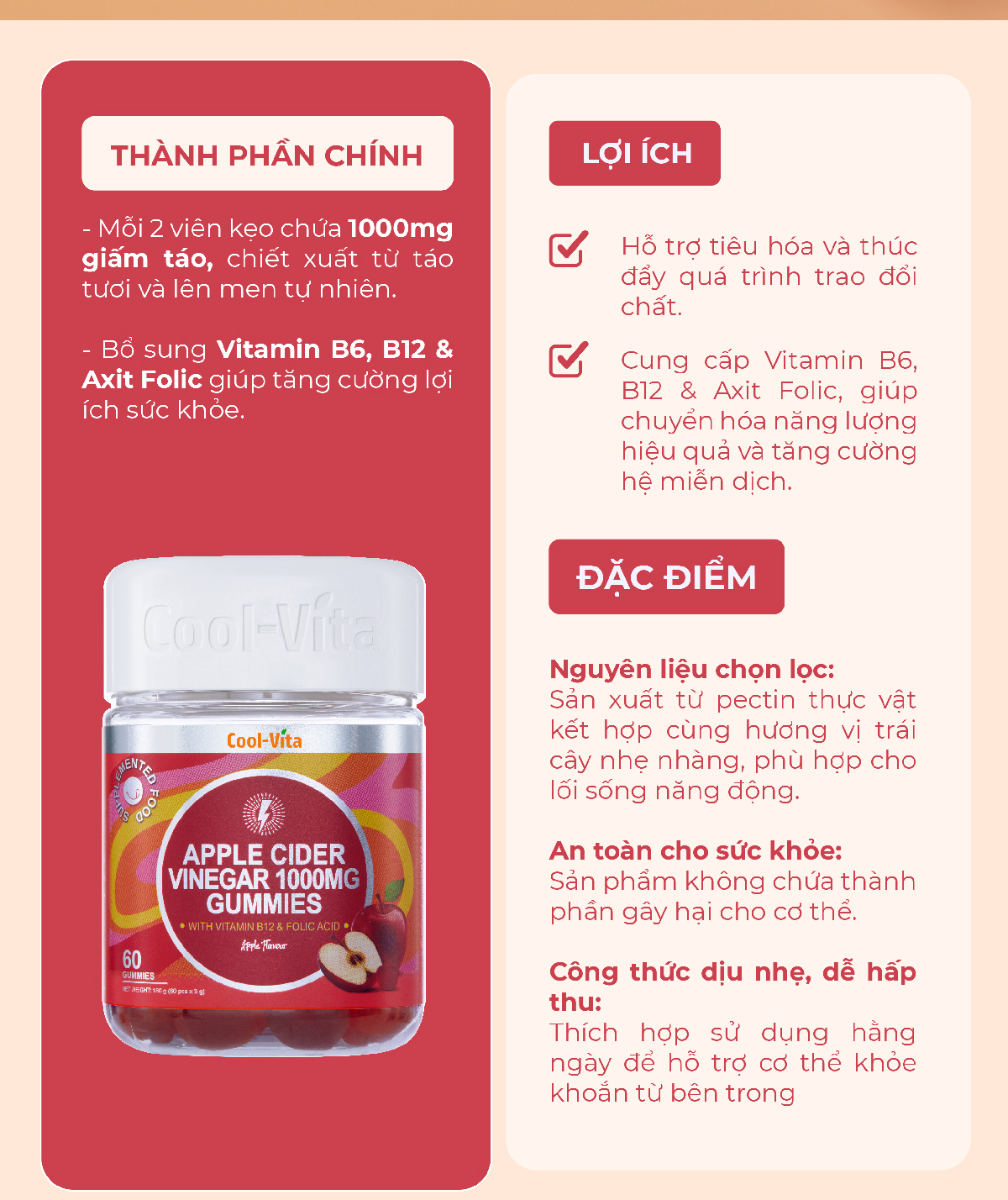 Kẹo dẻo giấm táo giúp bổ sung thêm Vitamin B12 & Axit Folic là một giải pháp bổ sung dinh dưỡng tiện lợi, giúp bạn cải thiện sức khỏe tiêu hóa và tăng cường hệ miễn dịch. Mỗi 2 viên kẹo dẻo chứa 1000mg giấm táo nguyên chất, kết hợp với các dưỡng chất quan trọng như Vitamin B12, Vitamin B6 và Axit Folic, mang lại hiệu quả tuyệt vời cho sức khỏe. Nếu bạn đang mong muốn cải thiện sức khỏe từ bên trong thì đừng nên bỏ qua sản phẩm Kẹo Dẻo Giấm Táo của CoolVita nhé!