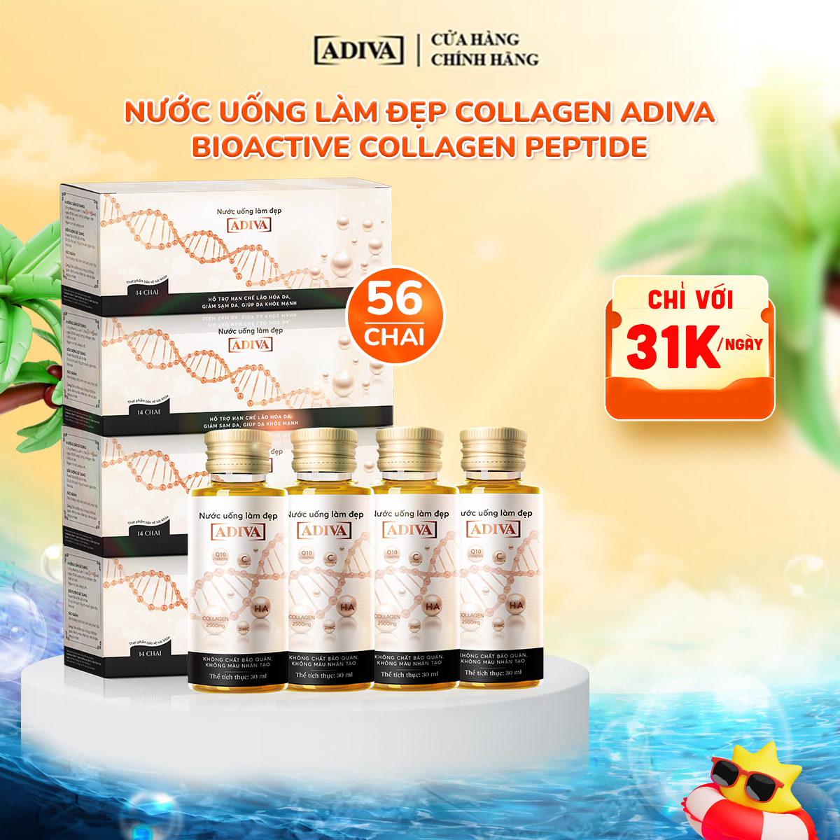 Nước Uống Làm Đẹp ADIVA (Tem trắng) chứa Bioactive Collagen Peptide - collagen thủy phân sinh học cho khả năng hấp thụ sâu, giúp tác động từ sâu bên trong lên làn da.