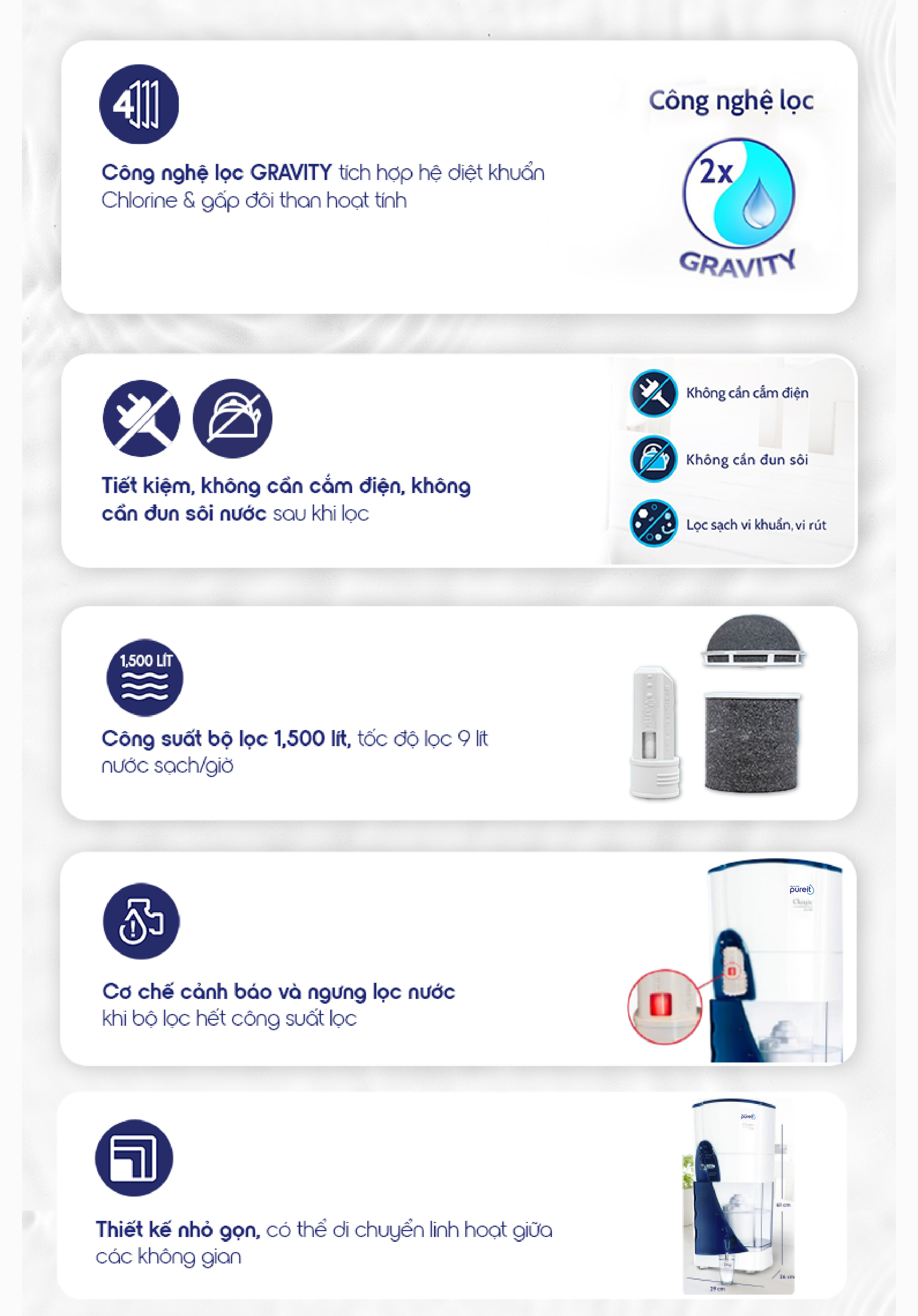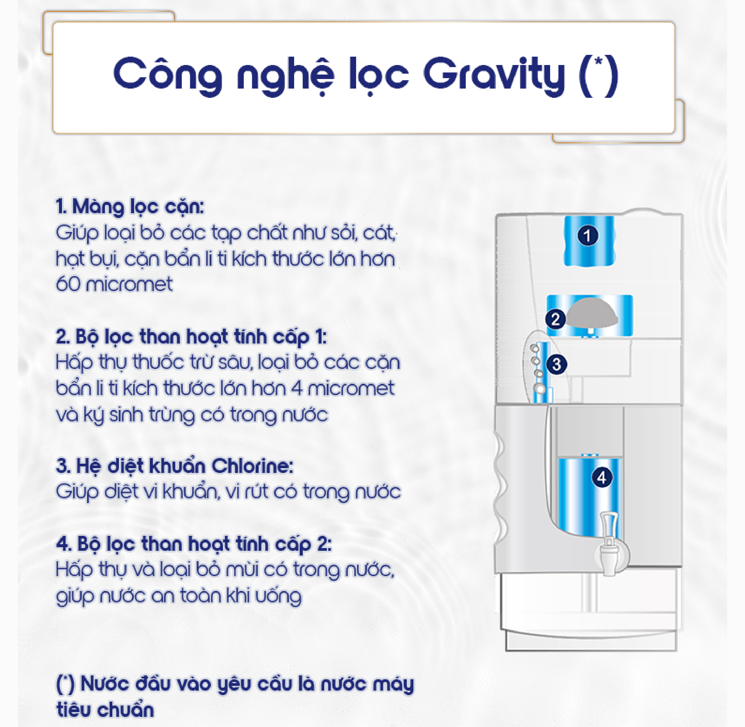 - Công nghệ lọc Gravity tích hợp hệ diệt khuẩn Chlorine và gấp đôi than hoạt tính (*) giúp loại bỏ các tạp chất như sỏi, cát, hạt bụi, cặn bẩn li ti kích thước lớn hơn 4 micromet, đồng thời giúp diệt vi khuẩn, vi rút, ký sinh trùng có trong nước