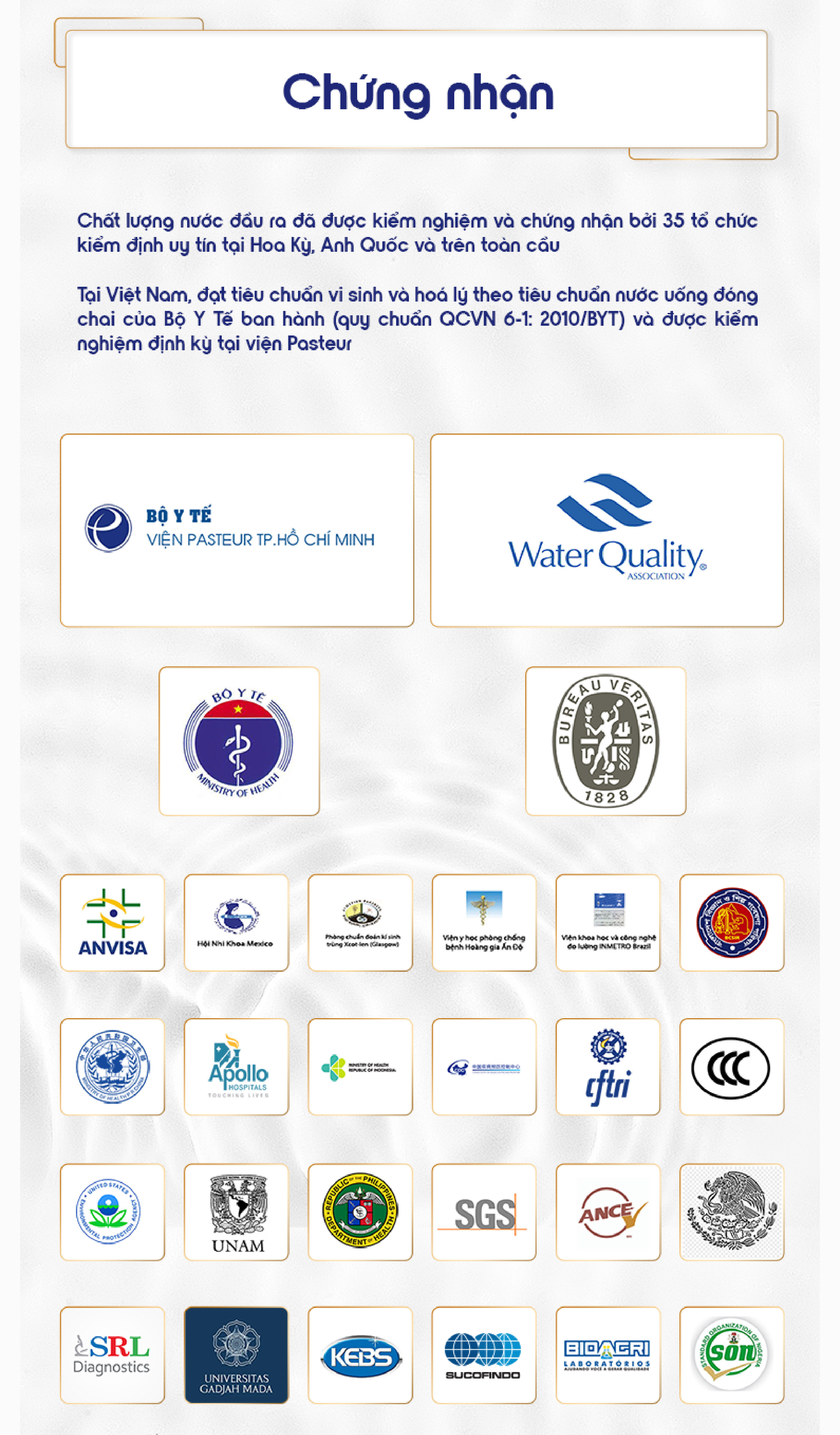 - Nước đầu ra đạt tiêu chuẩn nước uống trực tiếp theo quy định do Bộ Y Tế ban hành (quy chuẩn QCVN 6-1: 2010/BYT)
