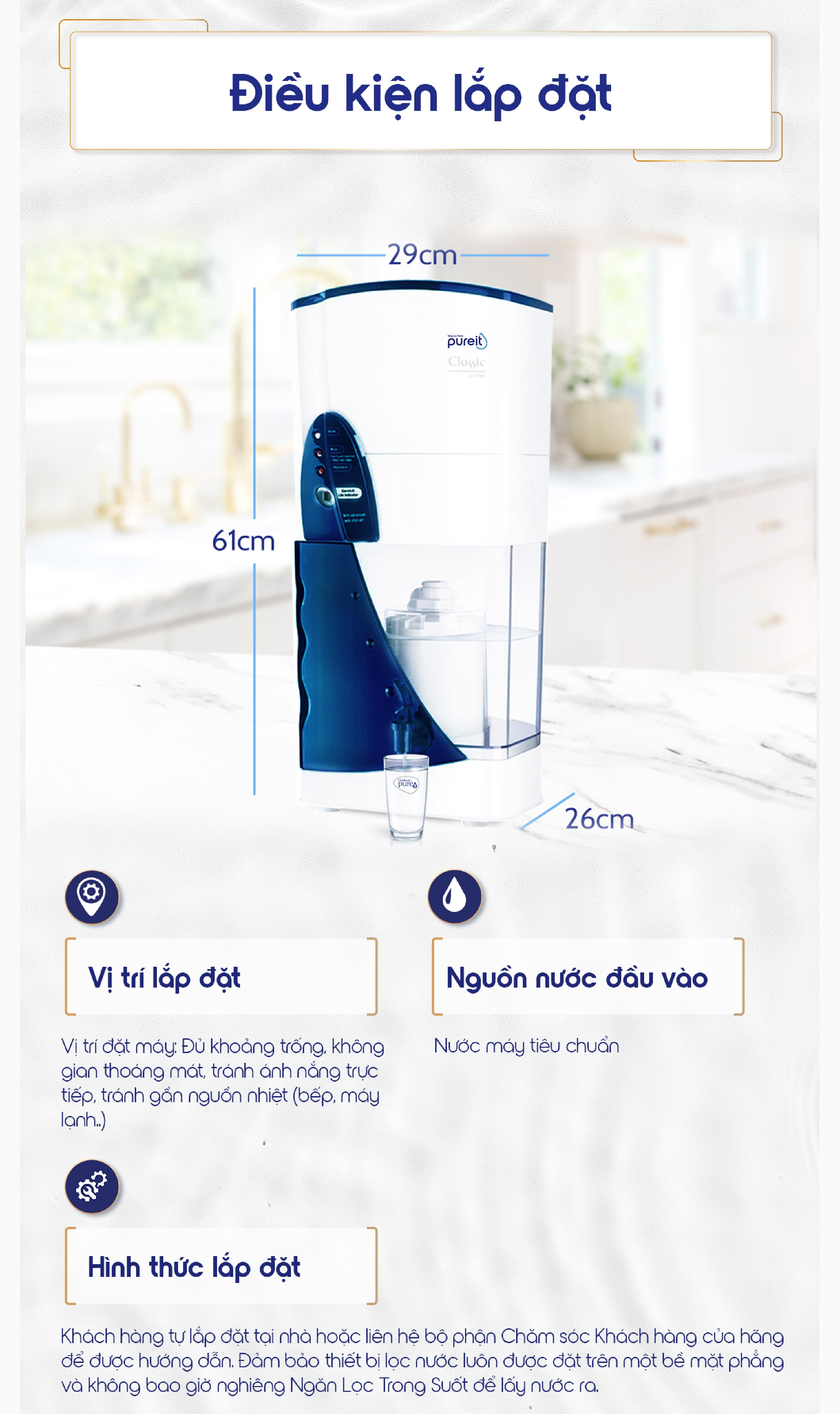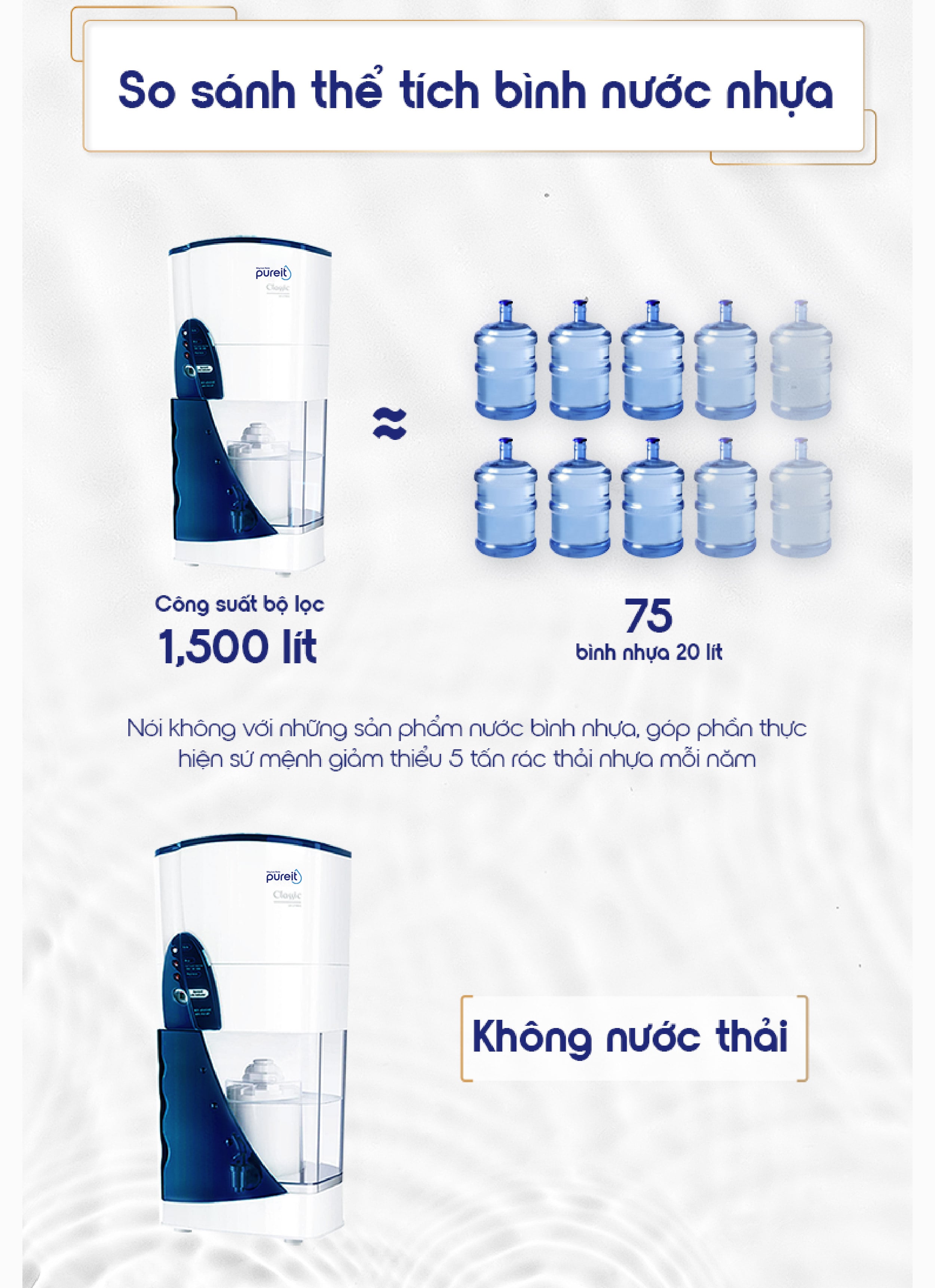 - Pureit Classic là một ứng cử viên sáng giá cho vị trí máy lọc nước siêu tiết kiệm không dùng điện, mang lại nguồn nước sạch khuẩn nhờ công nghệ lọc Gravity với hệ diệt khuẩn Chlorine và gấp đôi than hoạt tính (*).