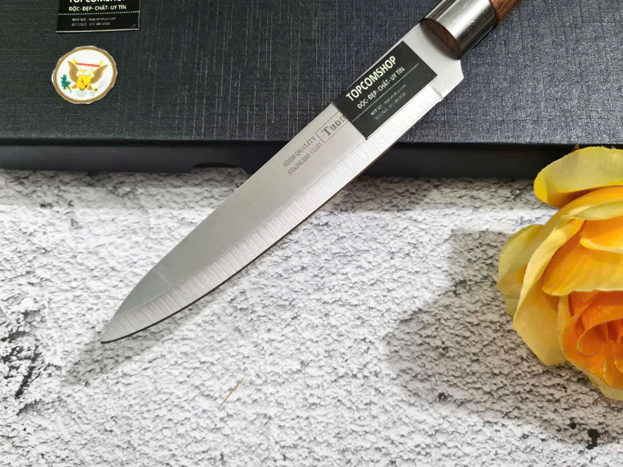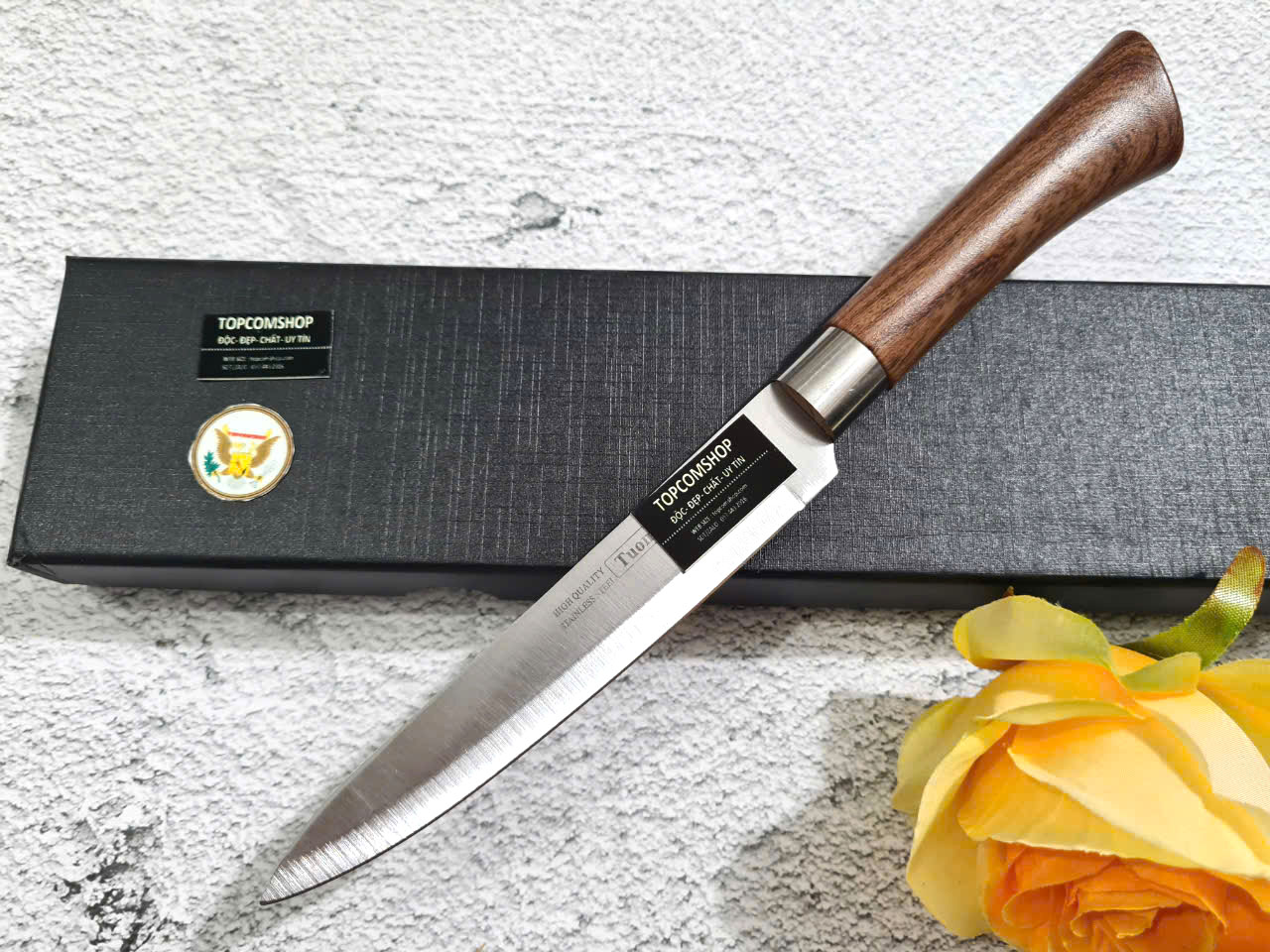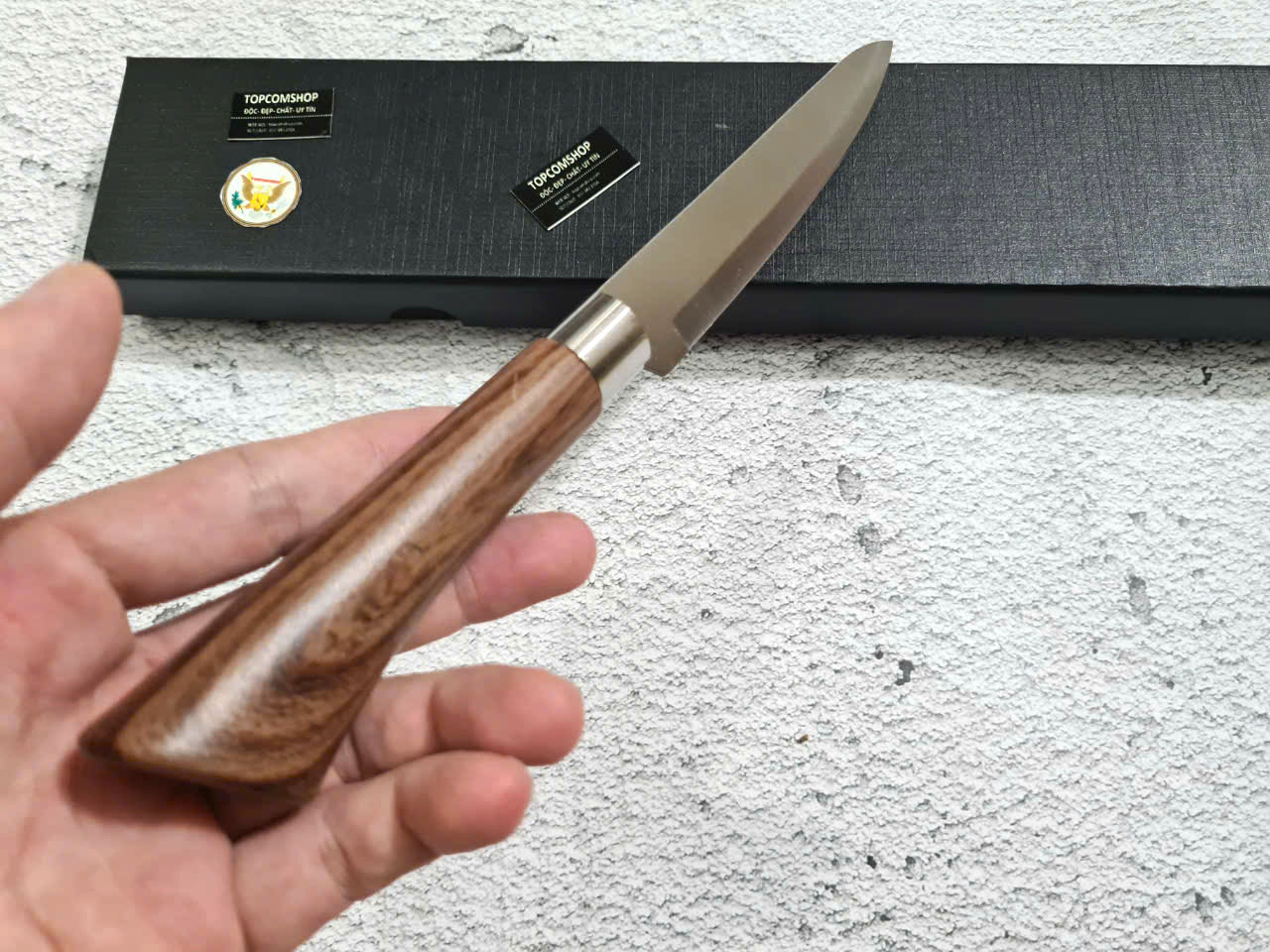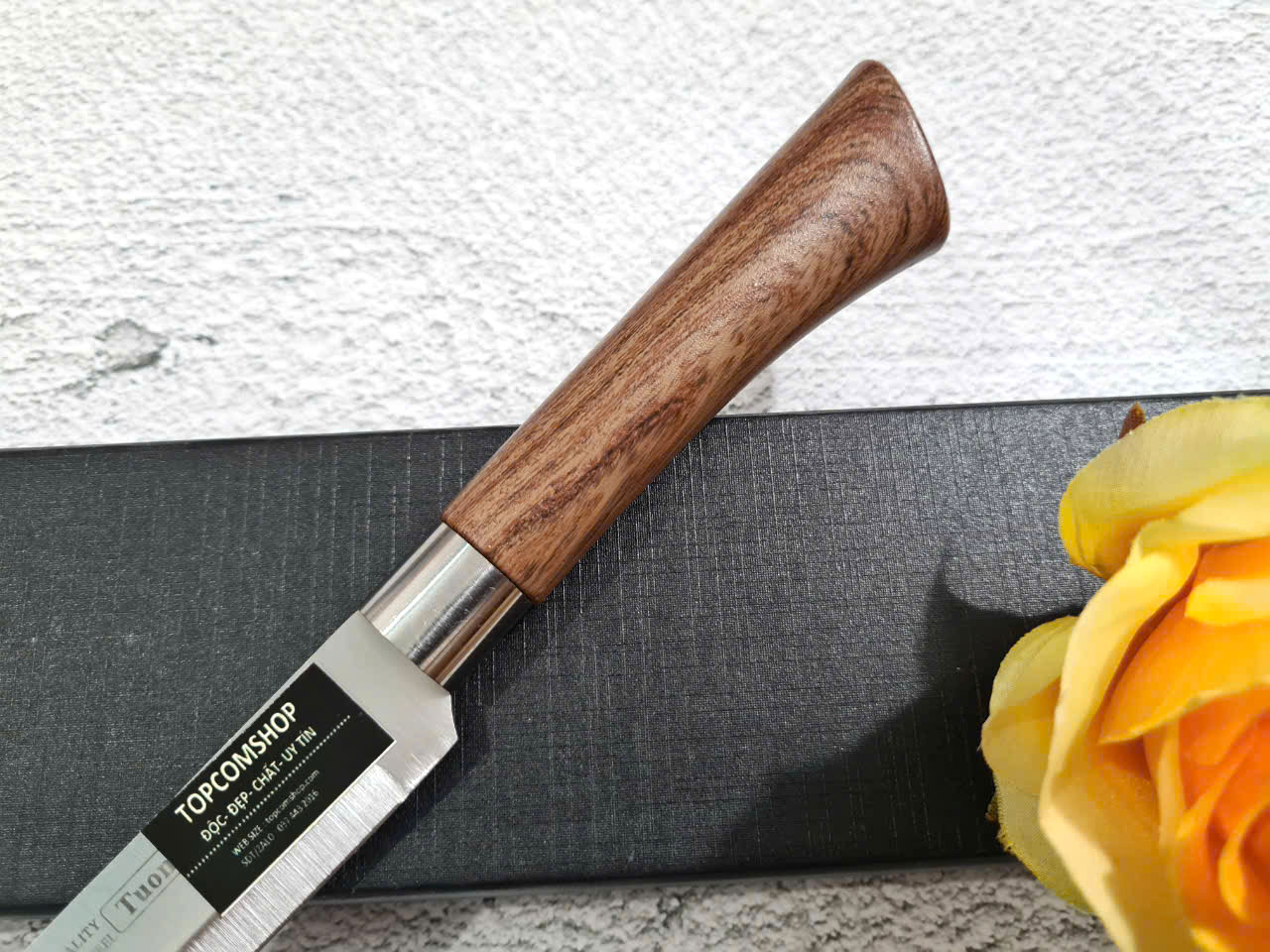 - Cán dao làm từ gỗ c ẩmlai sang trọng, tay cầm cong