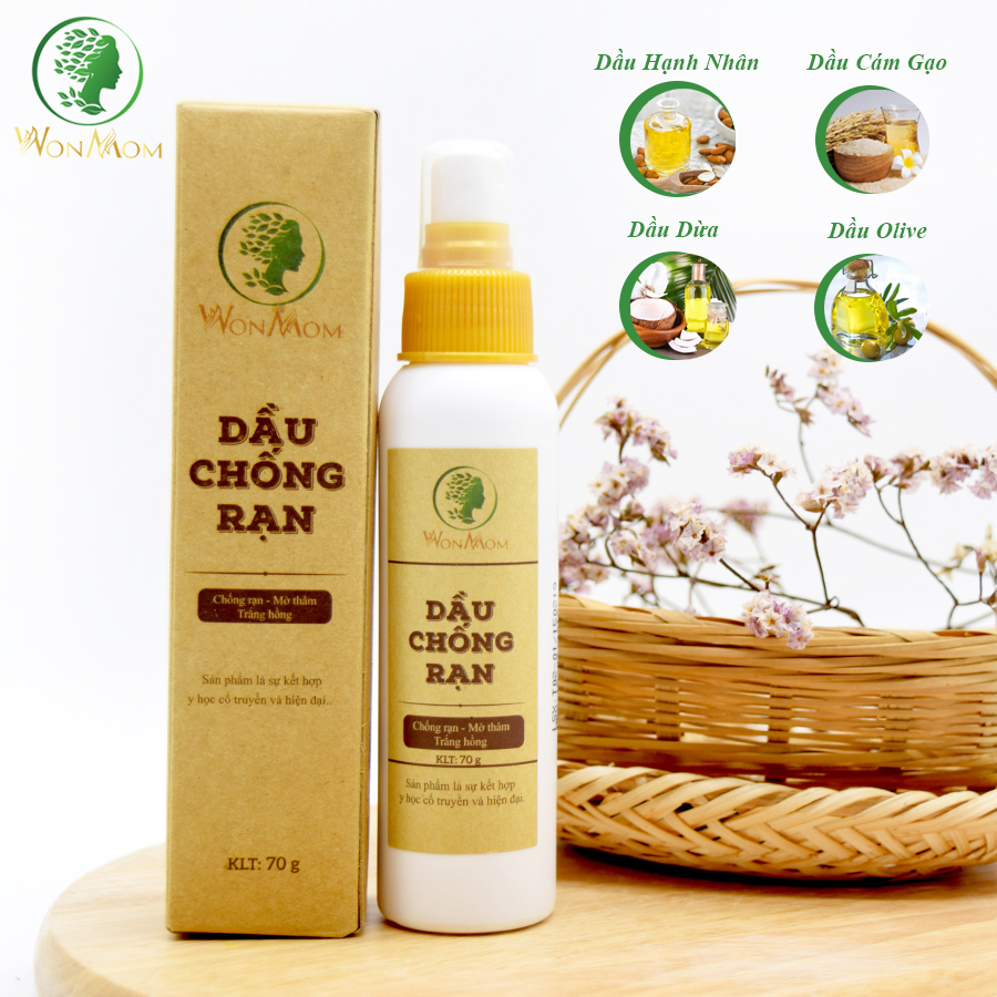 Dầu tinh chất chống rạn da Wonmom là 1 trong số những sản phẩm được yêu thích nhất của các mẹ bỉm sữa. Với nguyên liệu 100% nguồn gốc tự nhiên: Dầu dừa, dầu olive, dầu cám gạo, dầu hạnh nhân.