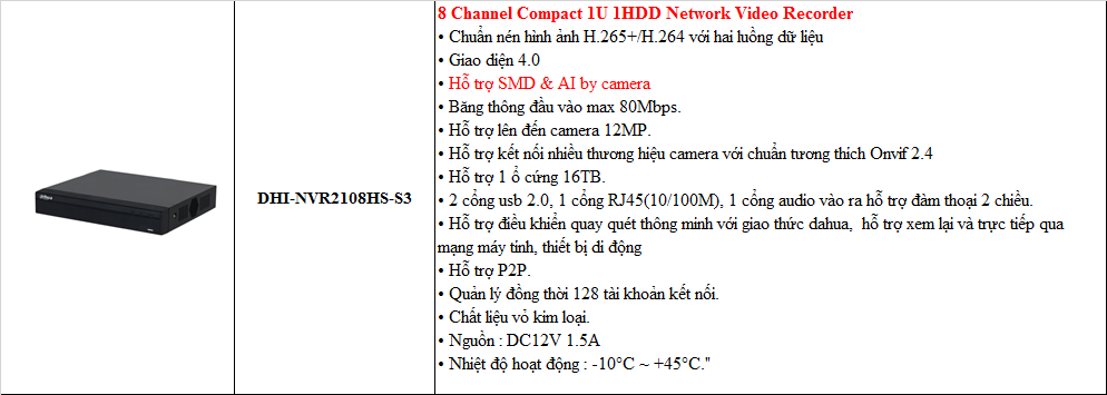 DHI-NVR2108HS-S3 | 8 Channel Compact 1U 1HDD Network Video Recorder • Chuẩn nén hình ảnh H.265+/H.264 với hai luồng dữ liệu • Giao diện 4.0 • Hỗ trợ SMD & AI by camera • Băng thông đầu vào max 80Mbps. • Hỗ trợ lên đến camera 12MP. • Hỗ trợ kết nối nhiều thương hiệu camera với chuẩn tương thích Onvif 2.4 • Hỗ trợ 1 ổ cứng 16TB. • 2 cổng usb 2.0, 1 cổng RJ45(10/100M), 1 cổng audio vào ra hỗ trợ đàm thoại 2 chiều. • Hỗ trợ điều khiển quay quét thông minh với giao thức dahua, hỗ trợ xem lại và trực tiếp qua mạng máy tính, thiết bị di động • Hỗ trợ P2P. • Quản lý đồng thời 128 tài khoản kết nối. • Chất liệu vỏ kim loại. • Nguồn : DC12V 1.5A • Nhiệt độ hoạt động : -10°C ~ +45°C."