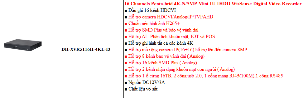DH-XVR5116H-4KL-I3 | 16 Channels Penta-brid 4K-N/5MP Mini 1U 1HDD WizSense Digital Video Recorder ■ Đầu ghi 16 kênh HDCVI ■ Hỗ trợ camera HDCVI/Analog/IP/TVI/AHD ■ Chuẩn nén hình ảnh H265+ ■ Hỗ trợ SMD Plus và bảo vệ vành đai ■ Hỗ trợ AI : Phân tích khuôn mặt, IOT và POS ■ Hỗ trợ ghi hình tất cả các kênh 4K ■ Hỗ trợ mở rộng camera IP(16+16) hỗ trợ lên đến camera 8MP ■ Hỗ trợ 8 kênh bảo vệ vành đai ( Analog) ■ Hỗ trợ 16 kênh SMD Plus ( Analog) ■ Hỗ trợ 2 kênh nhận dạng khuôn mặt con người ( Analog) ■ Hỗ trợ 1 ổ cứng 16TB, 2 cổng usb 2.0, 1 cổng mạng RJ45(100M),1 cổng RS485 ■ Nguồn DC12V/3A ■ Chất liệu vỏ sắt