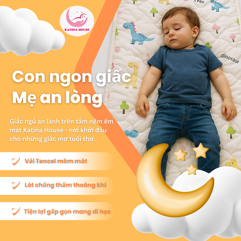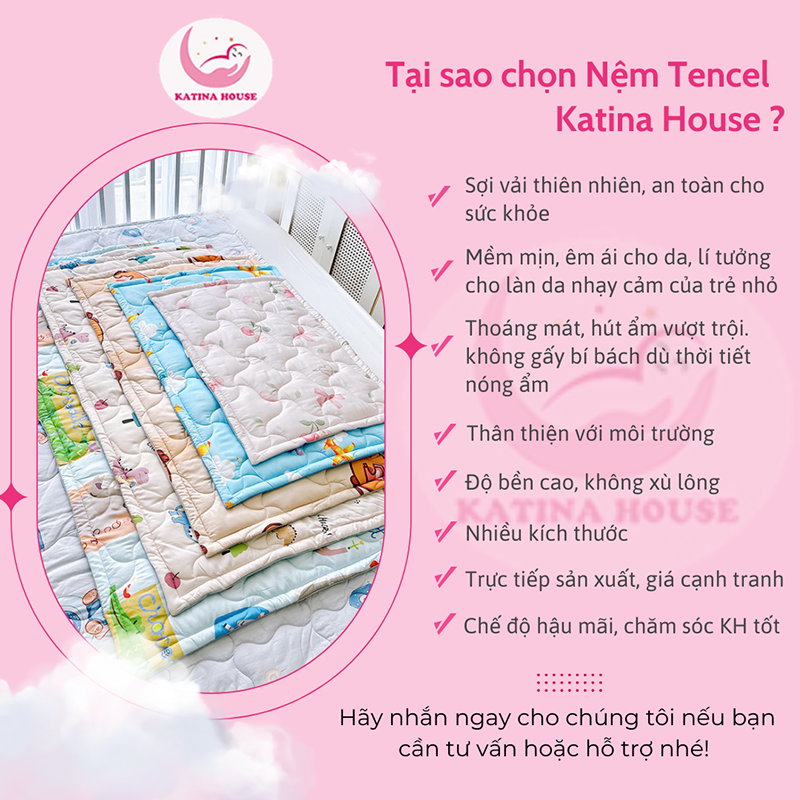 Đệm cho bé sơ sinh và trẻ nhỏ Katina House, 70x100cm, nệm chống thấm, vải Tencel mềm mịn mát