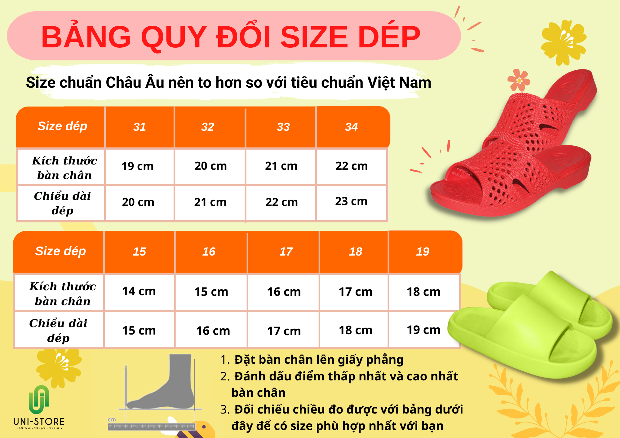 ⁃ Hướng dẫn chọn size: các bạn có thể đo chiều dài từ gót chân đến ngón chân cái, rồi so với bảng size để chọn size vừa mình nhé. Mách nhỏ là nên chọn nhỏ hơn kích thước chân mình một tí nhé.