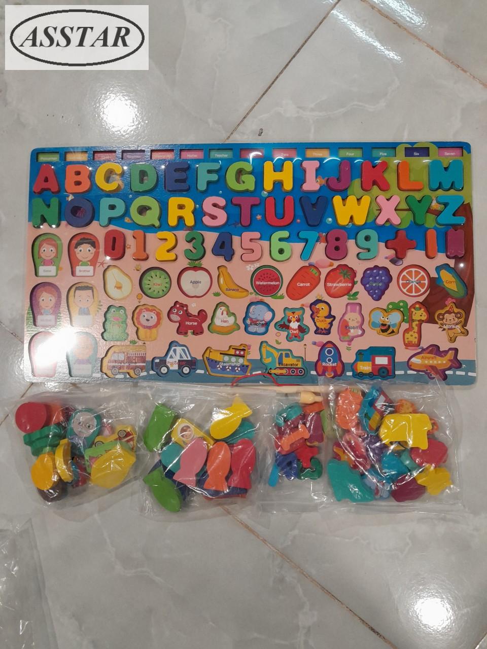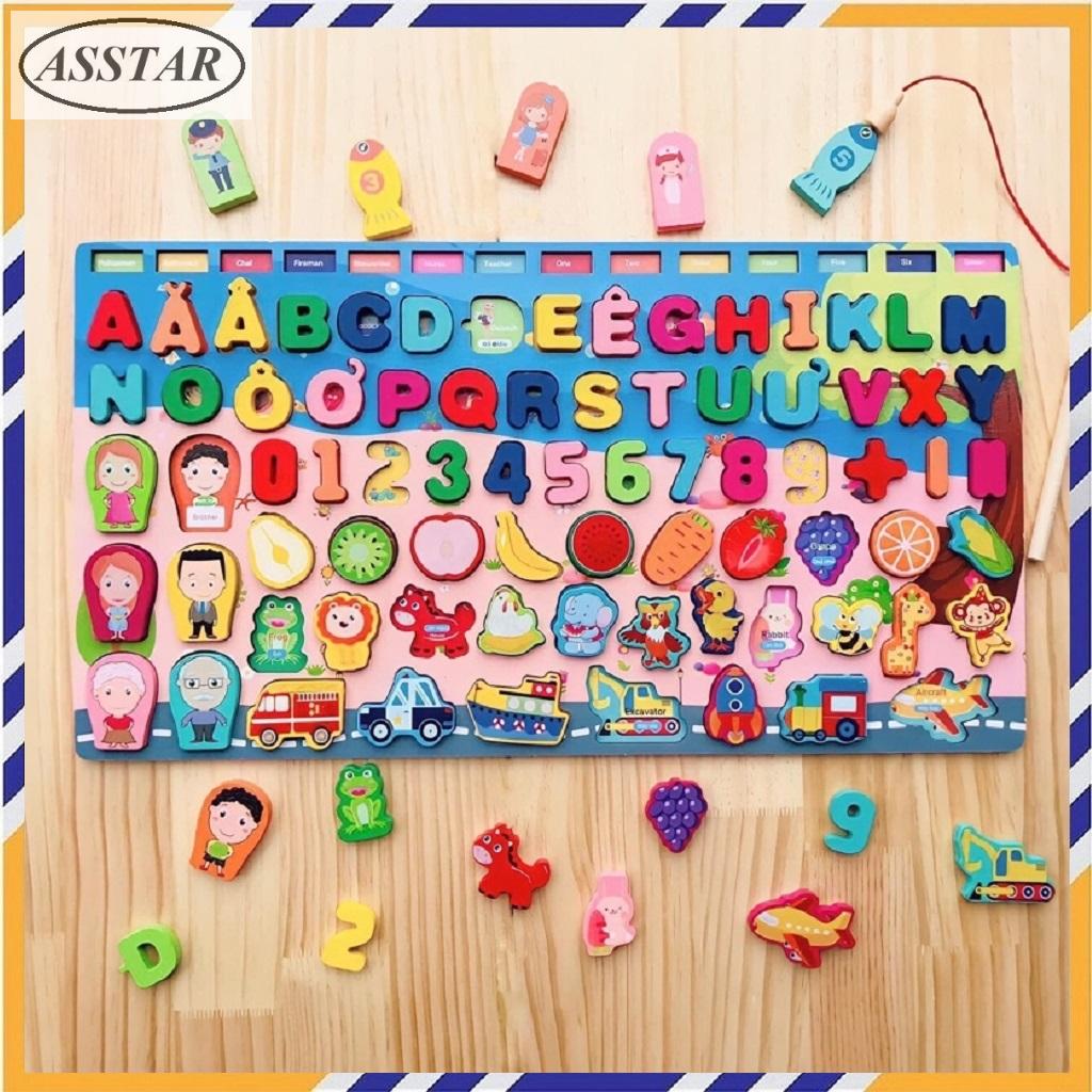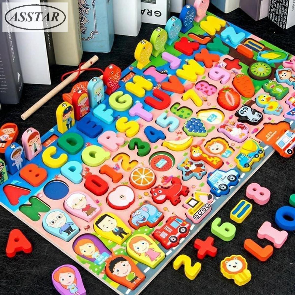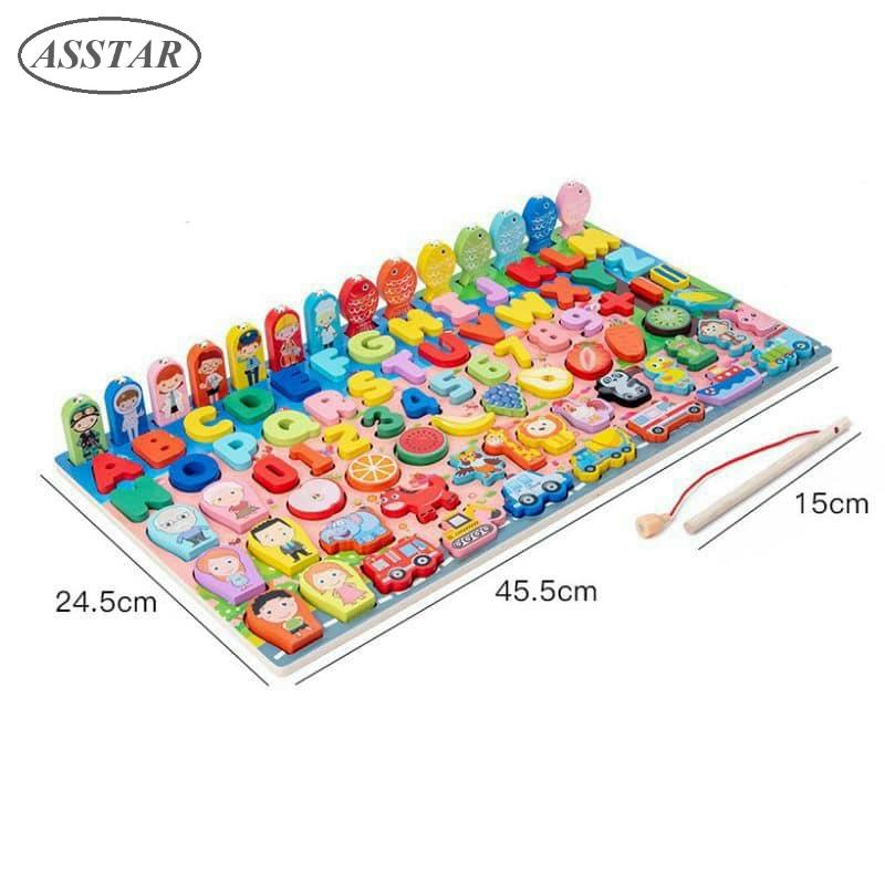 Bộ Bảng Gỗ Câu Cá Và Ghép Hình Học, Chữ Số, Chữ Cái, Phương Tiện 7in1 (7 trong 1)