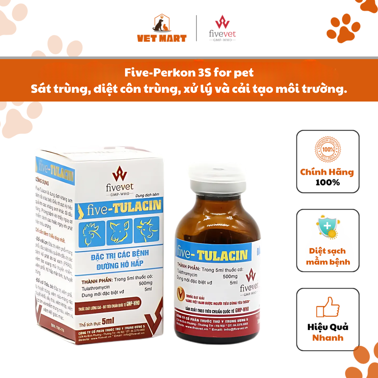 Công dụng: Five-Tulacin là dung dịch kháng sinh tiêm độc đáo, mang lại hiệu quả vượt trội, đặc biệt trong những trường hợp các loại kháng sinh khác không còn tác dụng. Sản phẩm giúp phòng và ngăn ngừa nhiều bệnh nguy hiểm ở lợn, trâu, bò chỉ với một liều duy nhất.