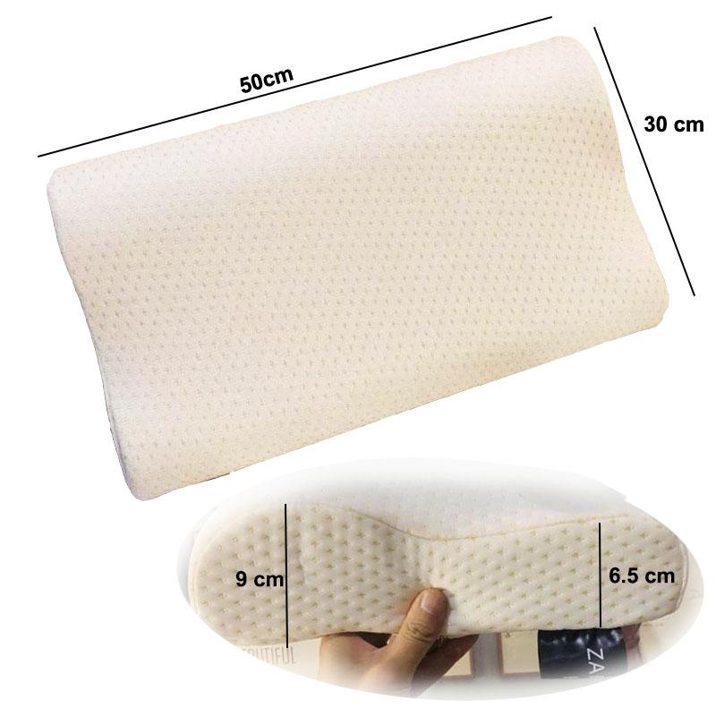 » Gối cao su có hình chữ nhật với thước 50cm - 30cm, bề mặt gối được thiết kế đặc biệt khiến bạn không bị mỏi cổ khi ngủ.