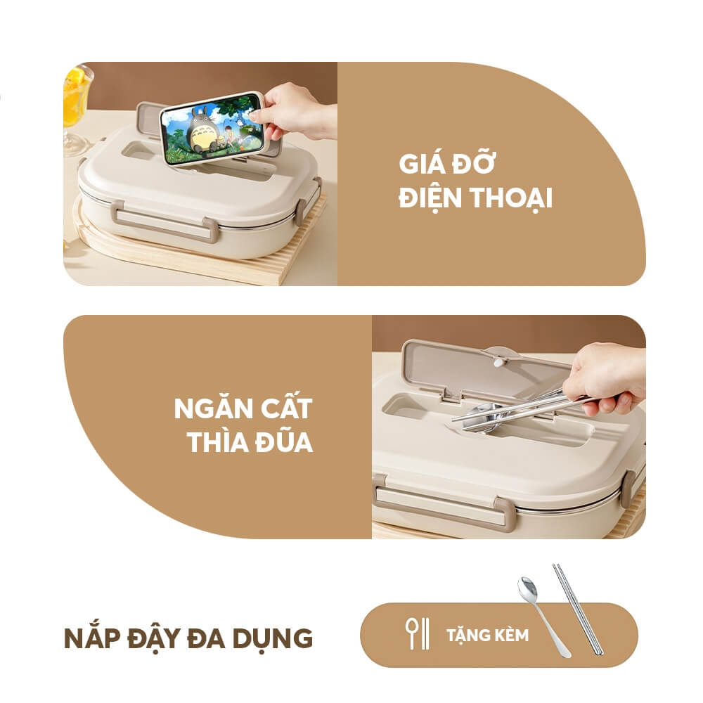 Khe đựng đũa ẩn được đặt trên nắp hộp ăn, thuận tiện cho việc đựng thìa, đũa.