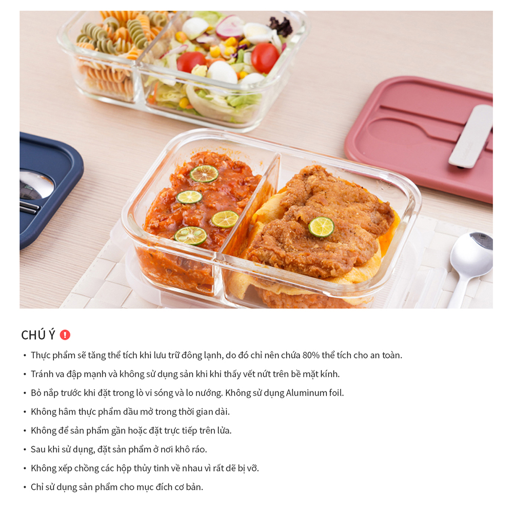 - Hộp cơm thủy tinh kèm muỗng đũa LocknLock LLG991CL 930ml thiết kế vách ngăn giúp thực phẩm không bị trộn lẫn khi bỏ vào chung một hộp.