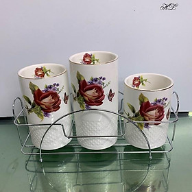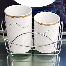 Ống đũa sứ đôi | ỐNG CẮM ĐŨA 2 CÓ THOÁT NƯỚC KHUNG KIM LOẠI | 2 HŨ SỨ ĐỰNG ĐŨA VÂN SẦN CAO CẤP VIỀN VÀNG