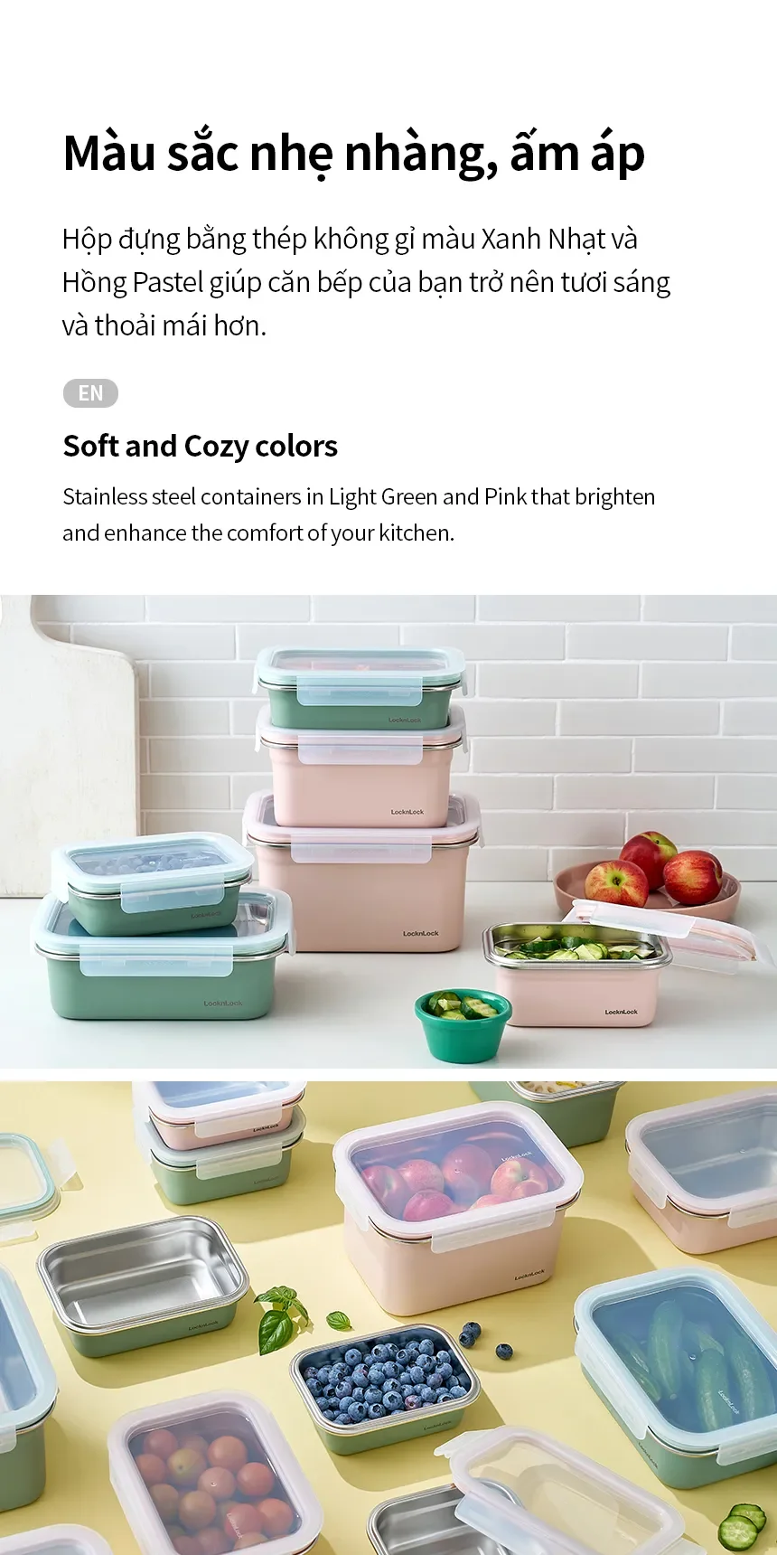 - MÀU SẮC NHẸ NHÀNG, ẤM ÁP: Hộp đựng bằng thép không gỉ màu Xanh Nhạt và Hồng Pastel giúp căn bếp của bạn trở nên sáng sủa và thoải mái hơn.