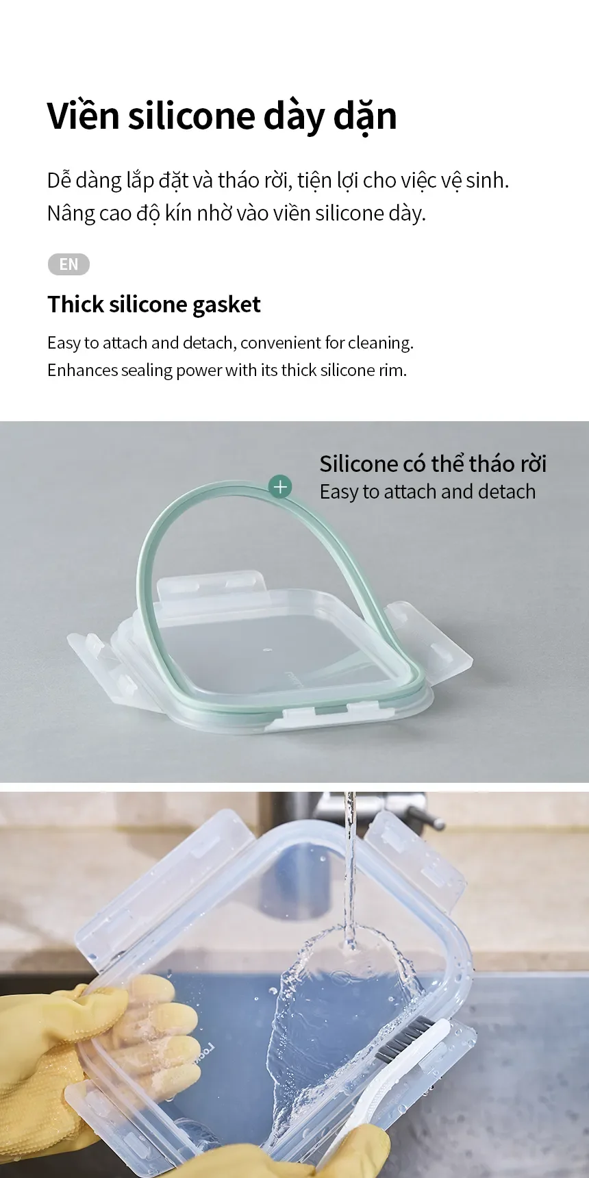 - VIỀN SILICONE DÀY DẶN: Dễ dàng lắp đặt và tháo rời, tiện lợi cho việc vệ sinh. Nâng cao độ kín nhờ vào viền silicone dày.
