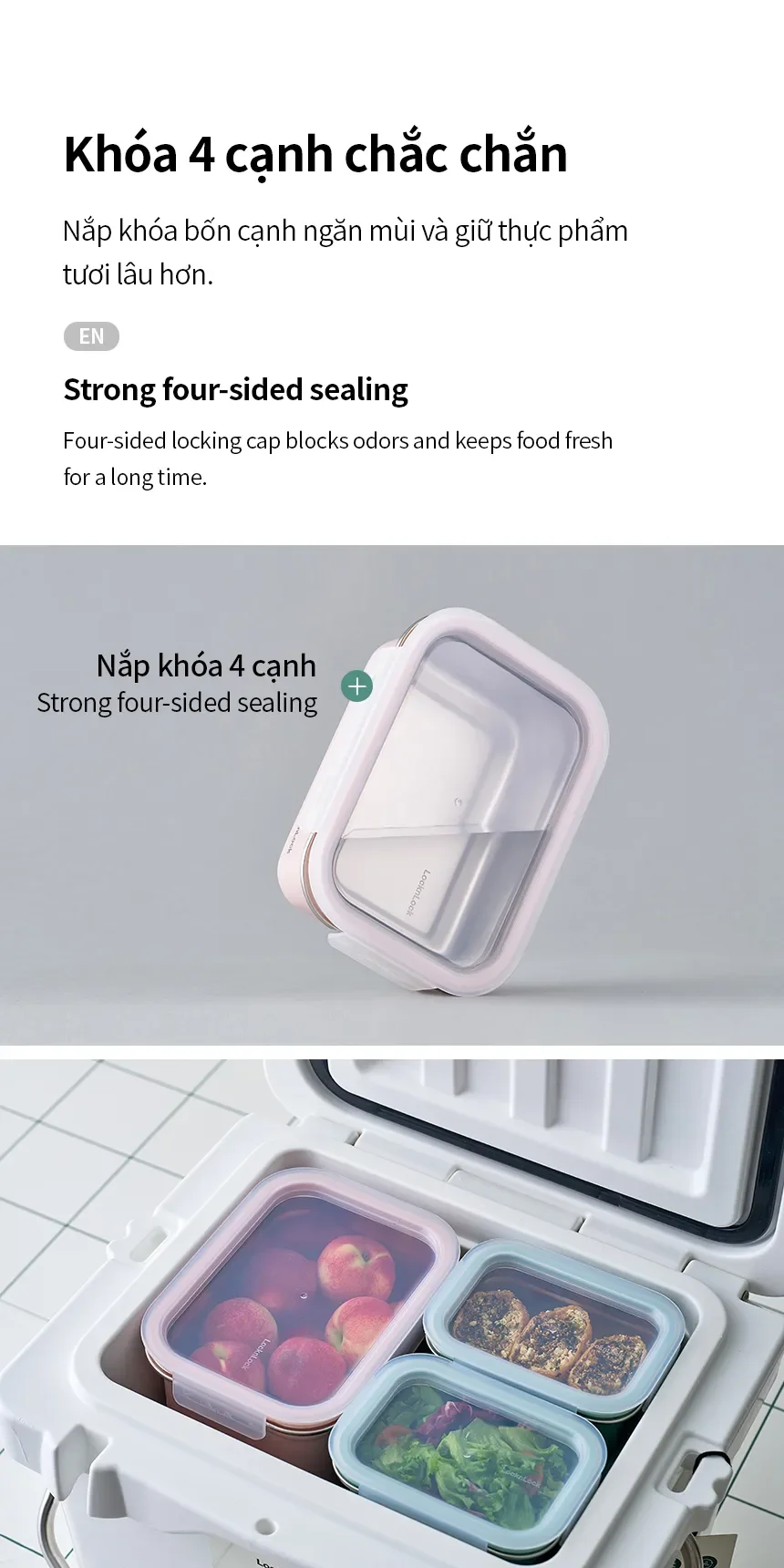- KHÓA BỐN CẠNH CHẮC CHẮN: Nắp khóa bốn cạnh ngăn mùi và giữ thực phẩm tươi lâu hơn.
