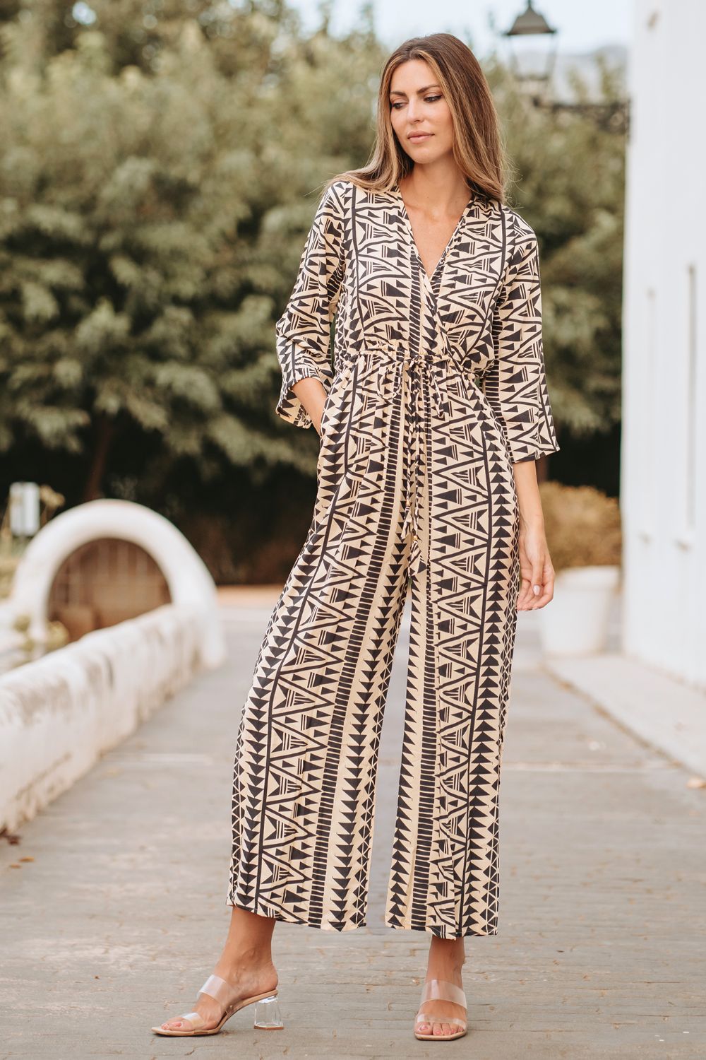 Jumpsuit Dài Tay Cotton, chất liệu cotton mềm mại. Họa tiết thổ cẩm độc đáo. Thun eo co giãn. Chân quần xẻ tà. Có túi 2 bên hông. Dài 135cm (45x135)