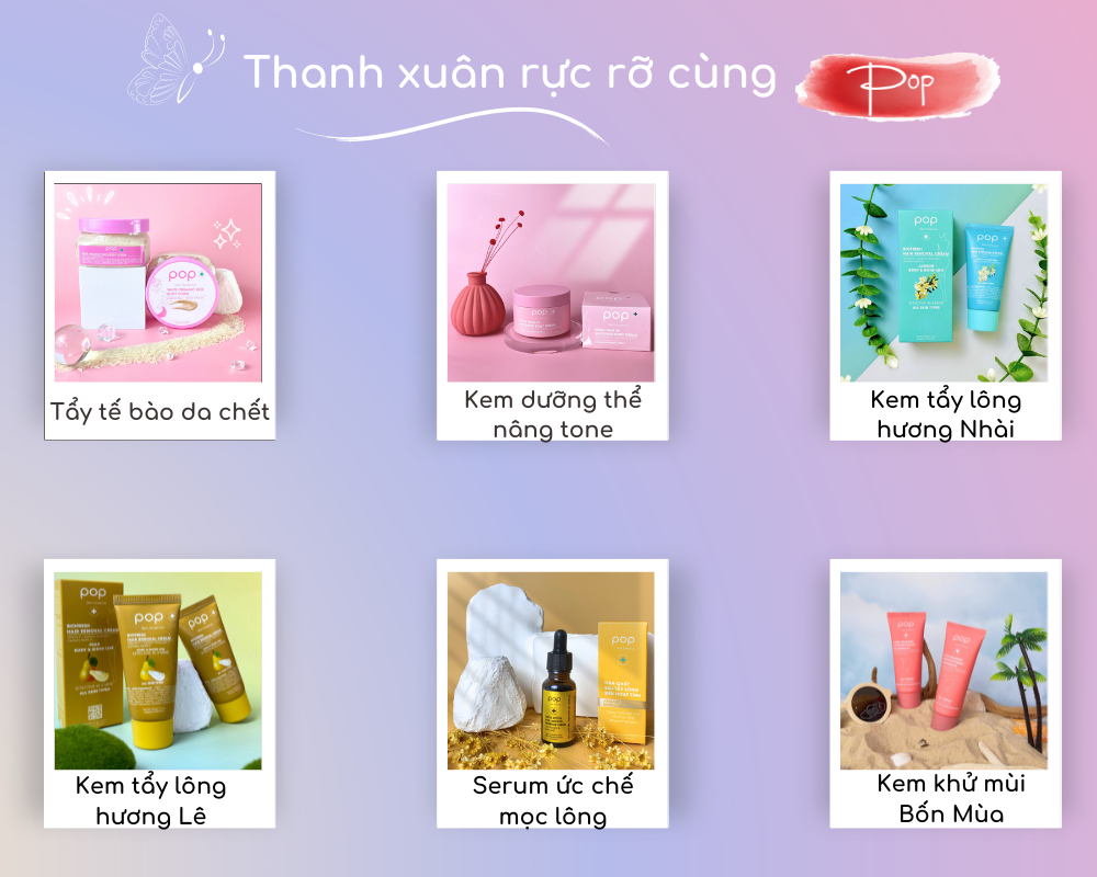 POP cung cấp giải pháp chuyên sâu, toàn diện về chăm sóc da và chăm sóc cơ thể. Các sản phẩm POP được đánh giá cao về tính lành, an toàn, hiệu quả thực chất và đã trở thành chọn lựa không thể bỏ qua của nhiều tín đồ làm đẹp trong quá trình gìn giữ, kéo dài tuổi thanh xuân và vẻ đẹp nổi bật tự nhiên.