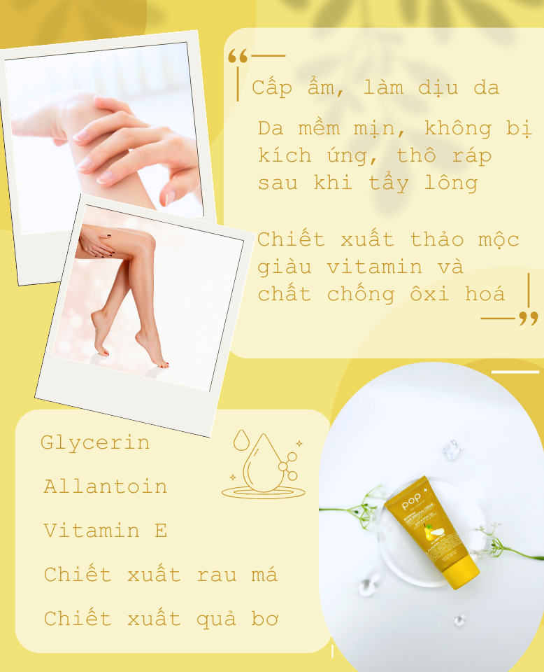 Giúp cho làn da của bạn sau khi tẩy lông được mềm mại, không bị kích ứng, không bị khô ráp và sáng mịn hơn.