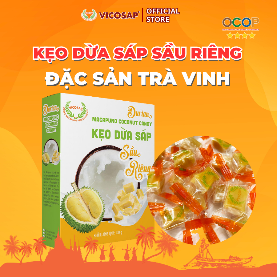 Kẹo dừa sáp VICOSAP vị sầu riêng kẹo mềm dẻo ít đường đặc sản Trà Vinh