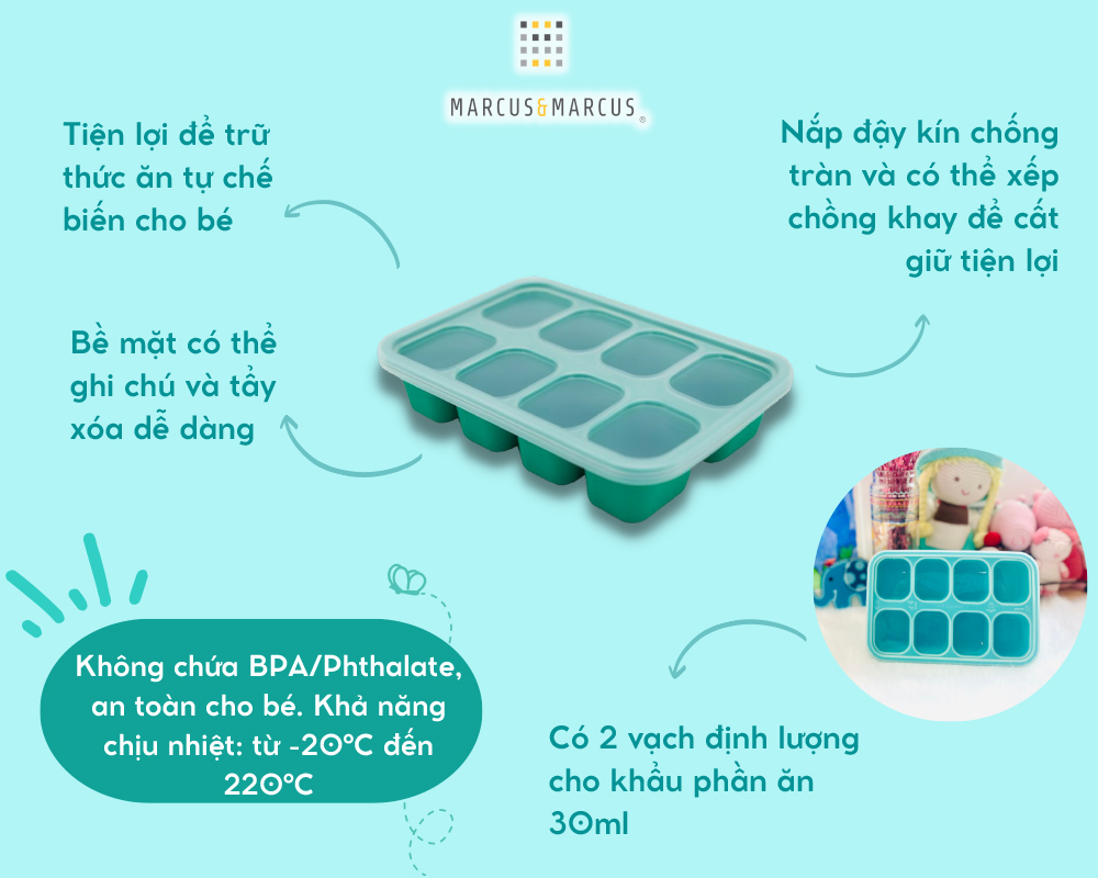 Khay silicon trữ đông đồ ăn dặm cho bé Marcus & Marcus được yêu thích không chỉ nhờ chất lượng vượt trội mà còn nhờ thiết kế thông minh, tiện lợi phù hợp để mẹ chế biến nhiều món ăn ngon và trữ đông an toàn cho bé trong suốt cả tuần, tiết kiệm thời gian tối đa.
