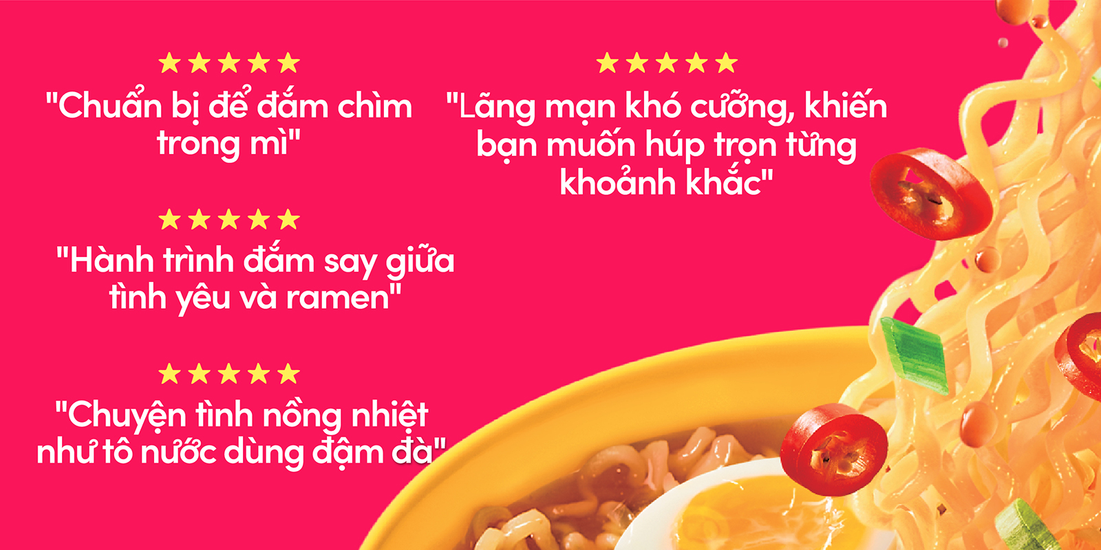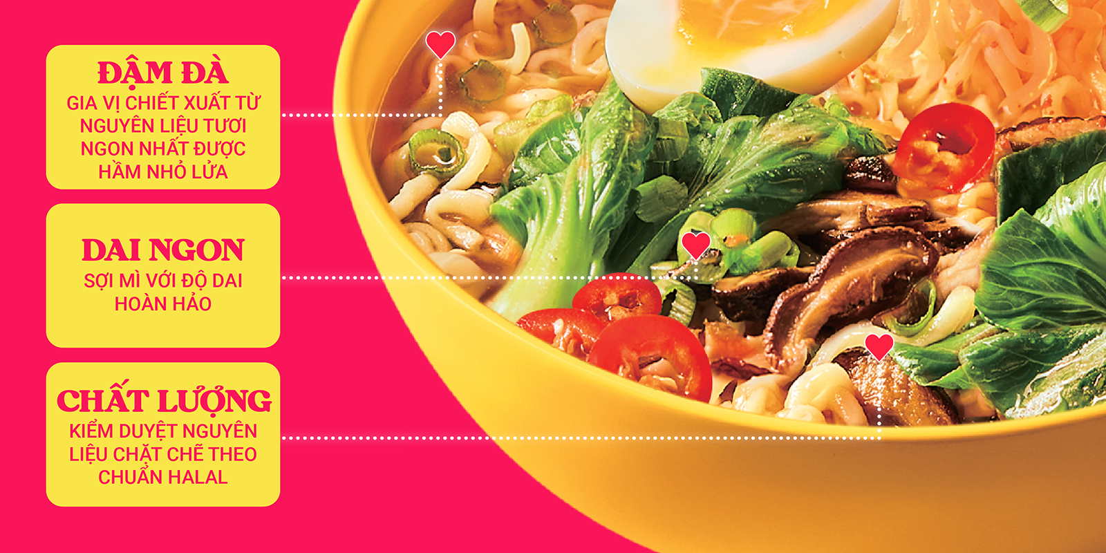 Súp gia vị: Muối, đường, bột nước tương (đậu nành, lúa mì, muối), chất điều vị (INS621, INS631, INS627), đạm thực vật thủy phân (đậu nành, lúa mì, bắp), ớt đỏ, bột nhão đậu nành, chiết xuất nấm men, bột tỏi, dầu thực vật (dầu cọ, sữa), glucose, tiêu đen, maltodextrin, chiết xuất tảo biển (tảo, muối, hàu), chiết xuất ớt.