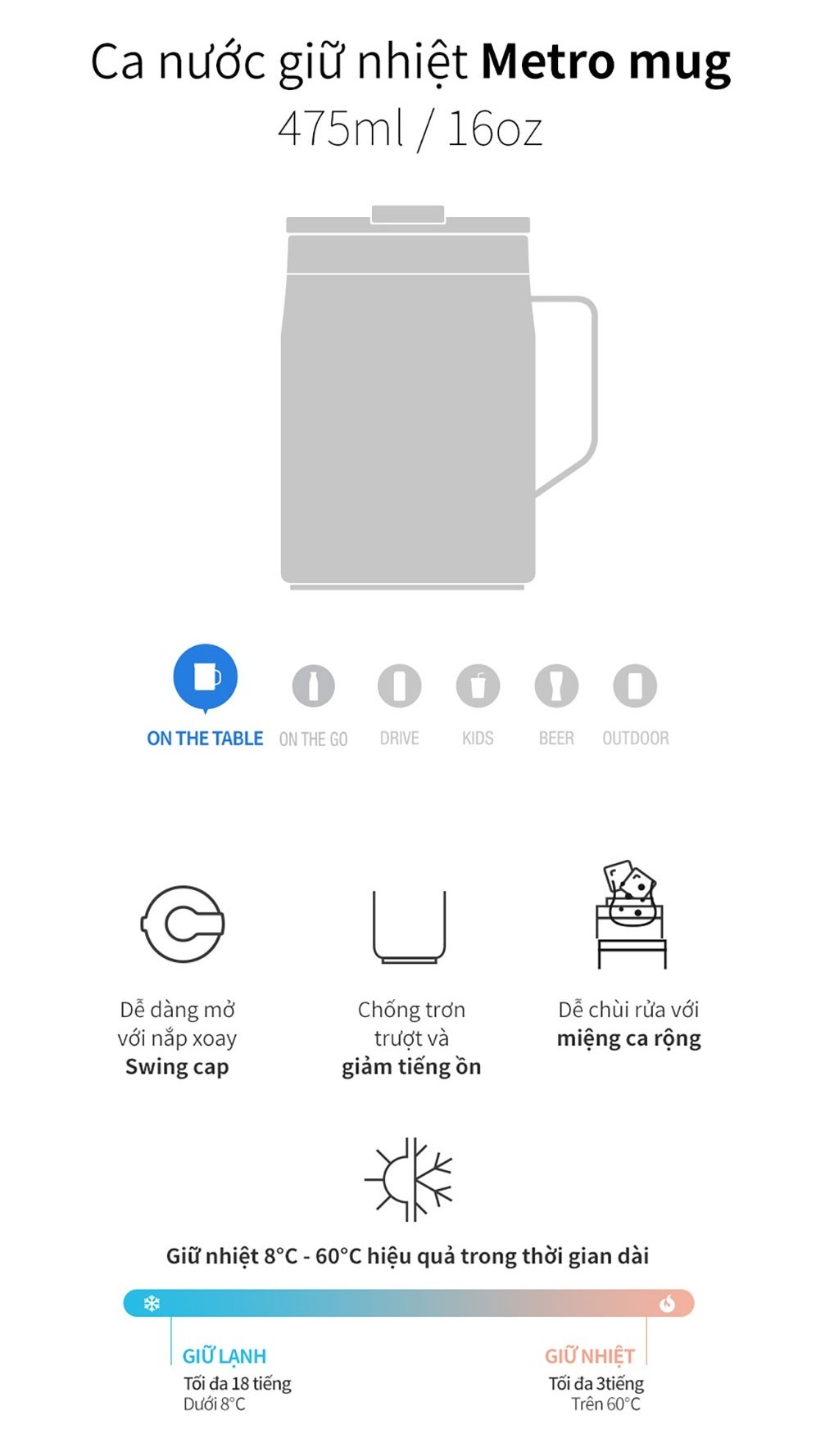 Giữ nhiệt 8°C - 60°C hiệu quả trong thời gian dài.