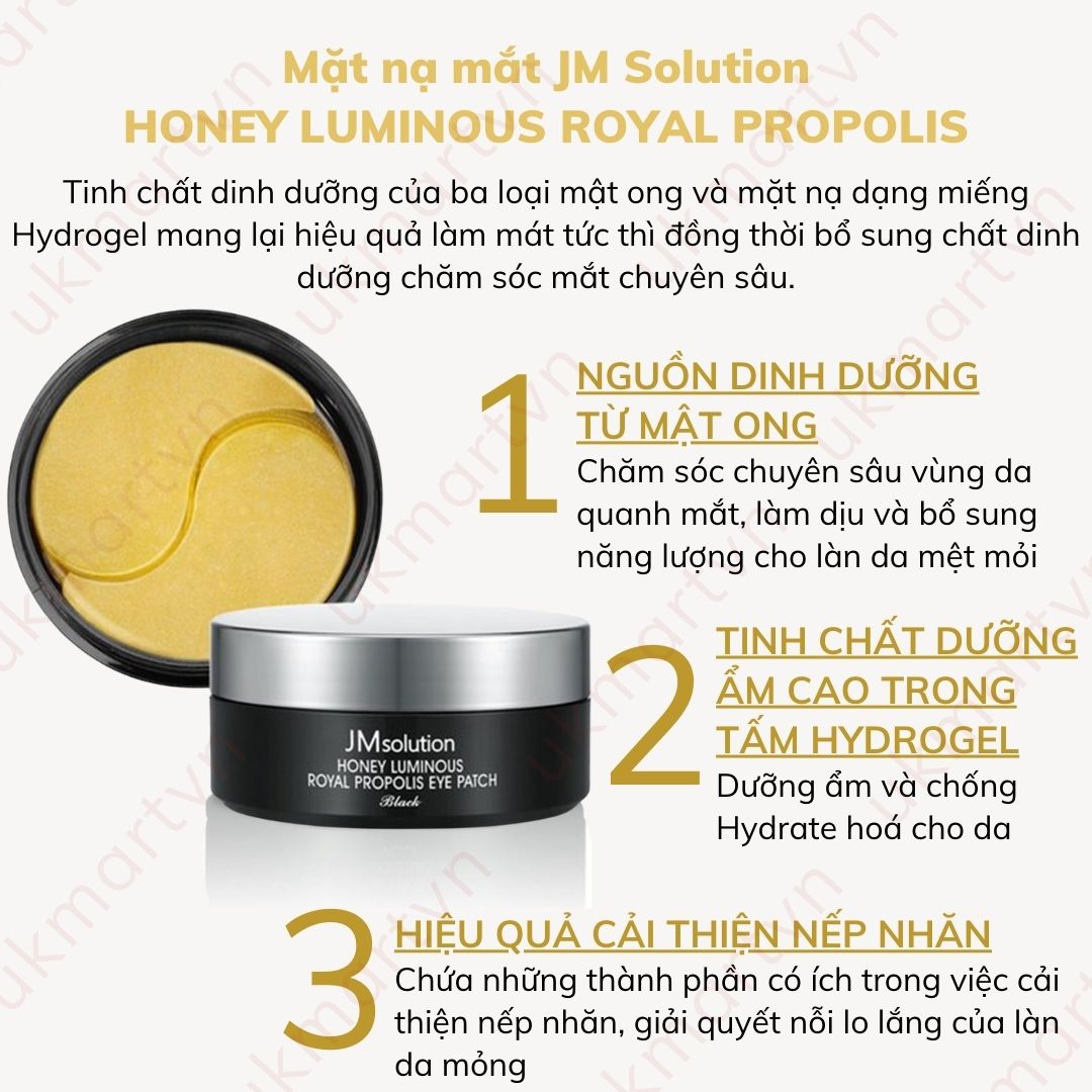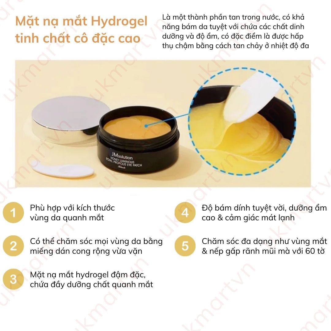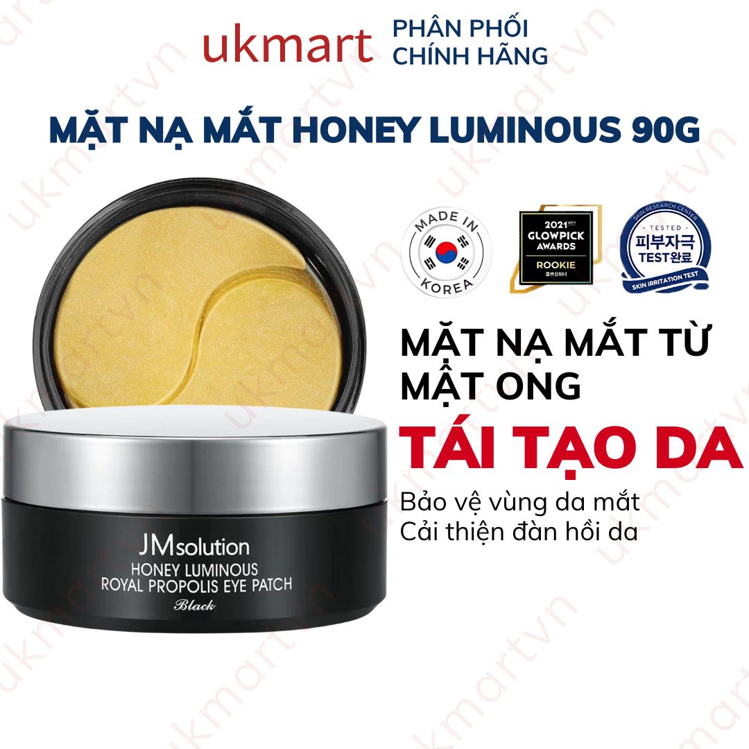 Mặt Nạ Xóa Thâm Quầng Mắt Và Ngăn Ngừa Nếp Chân Chim JM Solution Honey Luminous Royal Propolis Eye Patch Black giàu dưỡng chất từ mật ong có tác dụng chăm sóc, phục hồi làn da sau tổn thương và tăng độ đàn hồi da.Eye Patch giúp cung cấp độ ẩm da, duy trì sự mềm mại mịn màng và chống khô da.