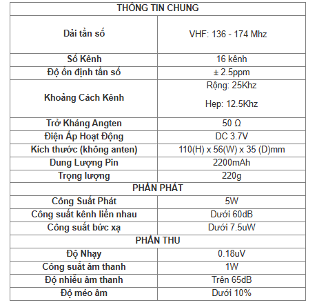 Thông số kỹ thuật của bộ đàm KBC PT-168