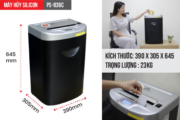 – Sản phẩm máy hủy tài liệu Silicon PS-836C sử dụng công nghệ hủy siêu vụn của Mỹ. Dùng để hủy bỏ nhiều tài liệu và giữ được an toàn bảo mật thông tin. Có thể hủy được giấy thông thường và hủy được CD, thẻ tín dụng.