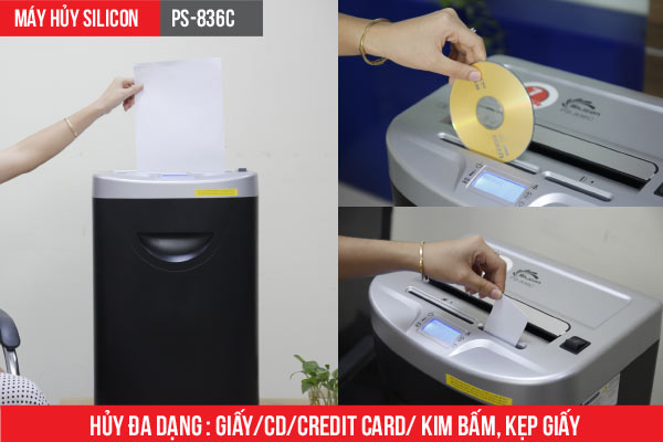 Máy hủy tài liệu Silicon PS-836C hủy được đĩa CD, Card, ghim bấm, kẹp giấy