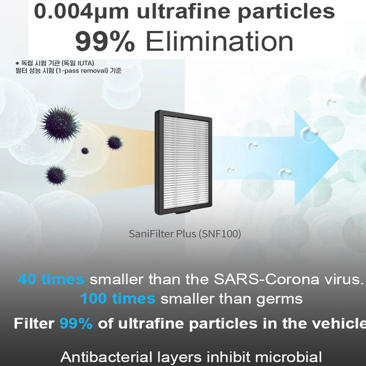 - Tẩm lọc SaniFiler Plus lọc 3 giai đoạn mạnh mẽ độc đáo loại bỏ tới 125 chất gây ô nhiễm có hại và khí thải và các loại virut, thông qua các lớp HEPA và HESA. Được chứng nhận độc lập bởi Airmid Healthgroup, công nghệ SaniFilter Plus cũng loại bỏ tới 99% các hạt bụi siêu mịn và các chất gây dị ứng trong xe. Lọc hiệu quả các hạt nhỏ đến 0,004um, bao gồm các loại vi rút và vi khuẩn tức là nhỏ hơn 40 lần so với Virut SARS-Corona, nhỏ hơn 100 lần so với các loại virut thông thường .