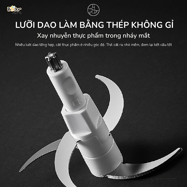 – Thiết kế thông minh: Lưỡi dao làm bằng thép không gỉ giúp người dùng xay nhuyễn thực phẩm trong nháy mắt. Máy có nhiều lưỡi dao tổng hợp, xay thực phẩm ở nhiều góc độ, từ đó đem lại kết cấu thịt nhỏ mềm.