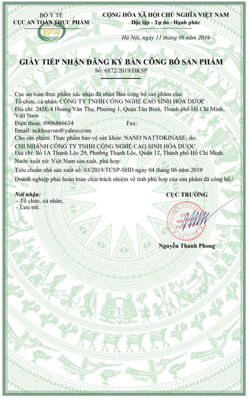- Nano Nattokinase được kiểm định chứng nhận chất lượng sản phẩm và cấp phép lưu hành