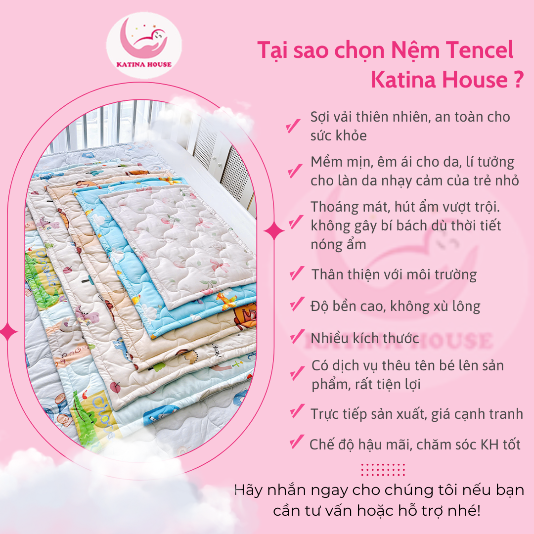 Nệm cho trẻ sơ sinh Katina House , có lót chống thấm, vải tencel mềm mát mịn, thoáng khí thấm hút tốt