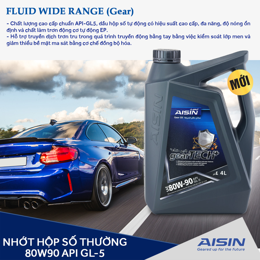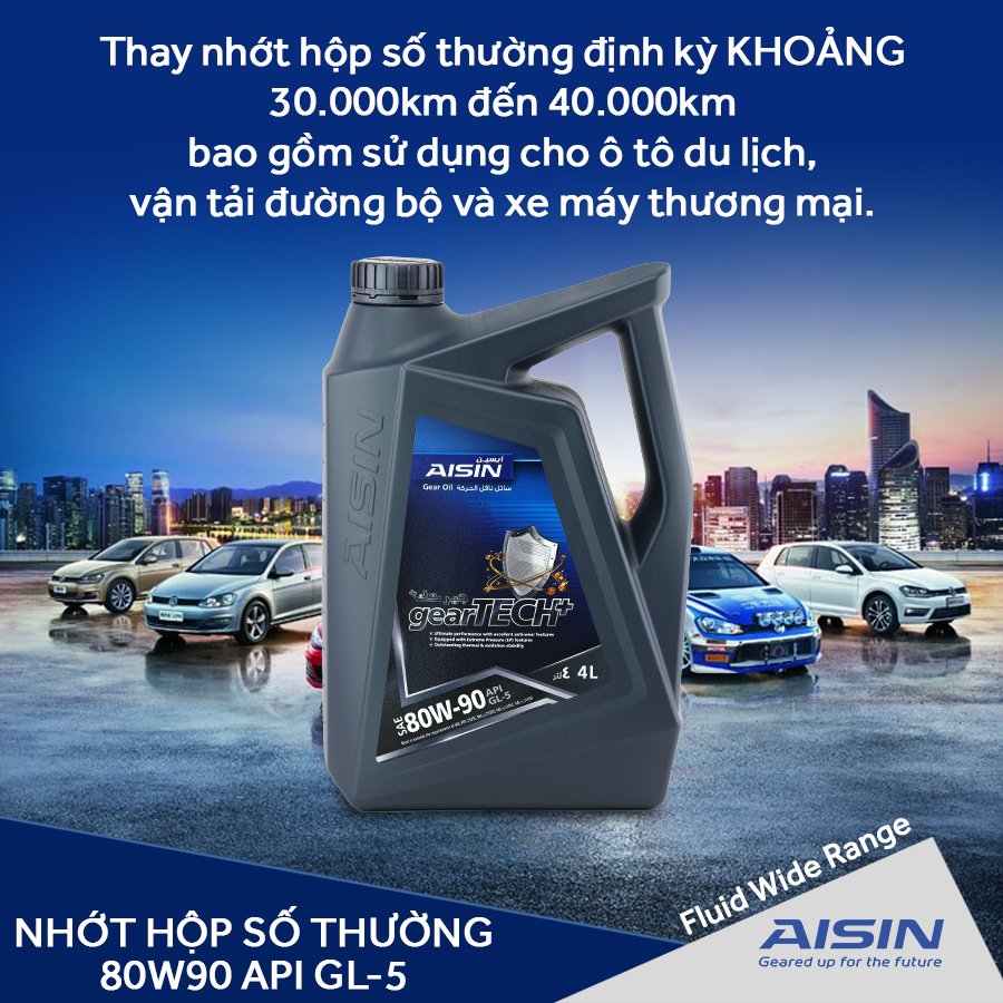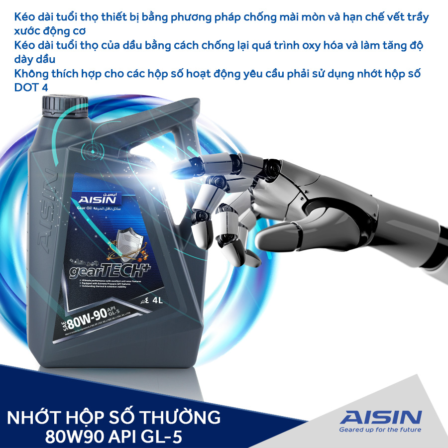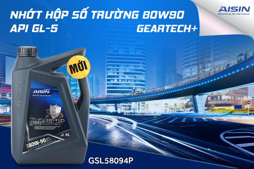 - Nhớt hộp số thường AISIN GSL58094P 80W-90 GL-5 gearTECH+ Gear Oil 4L là dầu bôi trơn hộp số theo tiêu chuẩn API GL-5, MIL-PRF-20105E, MIL-L21050D, MIL-L-2150B, có khả năng duy trì nhiệt độ hộp số ổn định và kết hợp áp suất cao giúp tăng hiệu suất đồng thời cải thiện hoạt động bôi trơn được tốt hơn, hợp cho các dòng xe sử dụng hộp số thường.