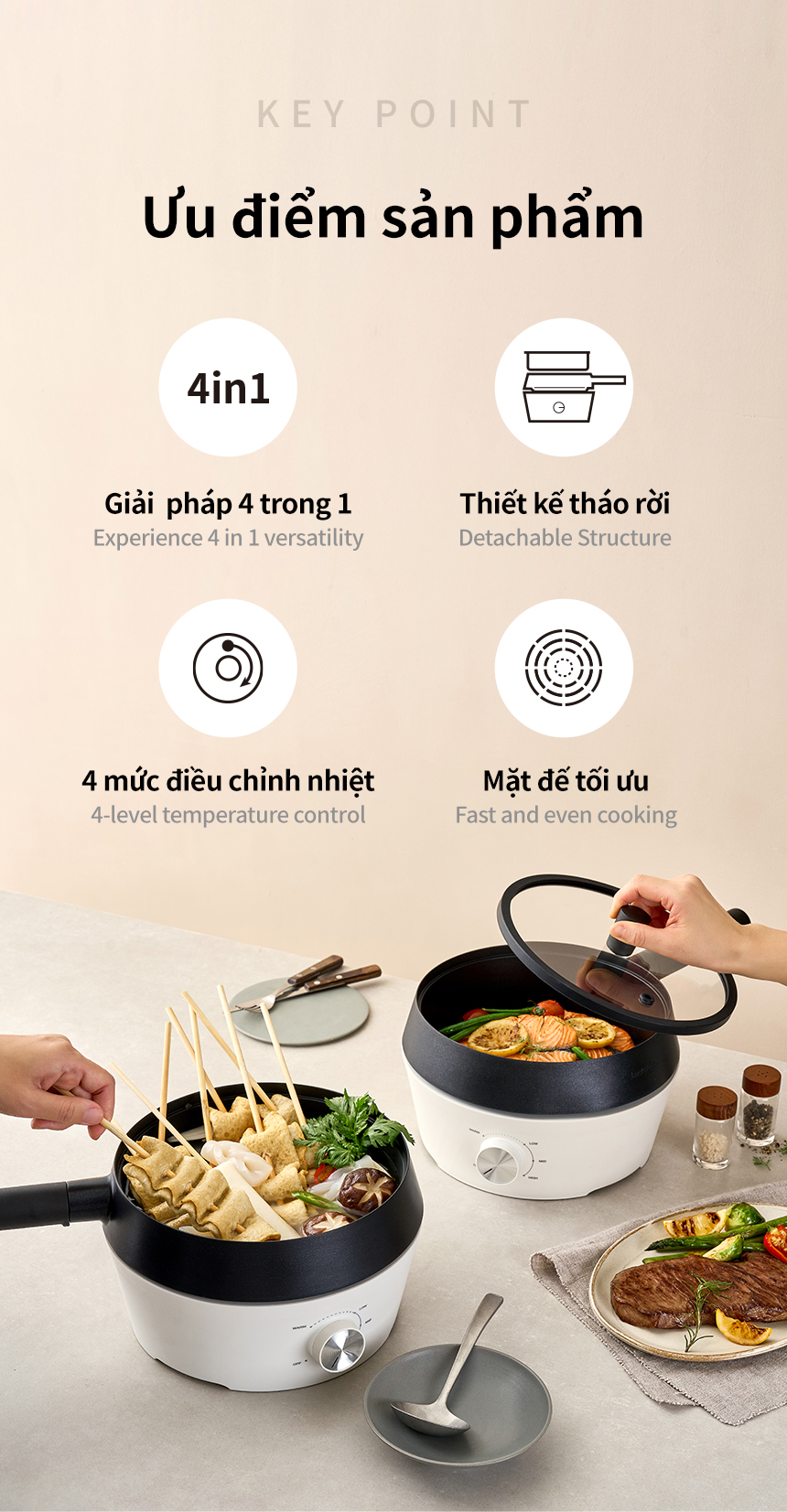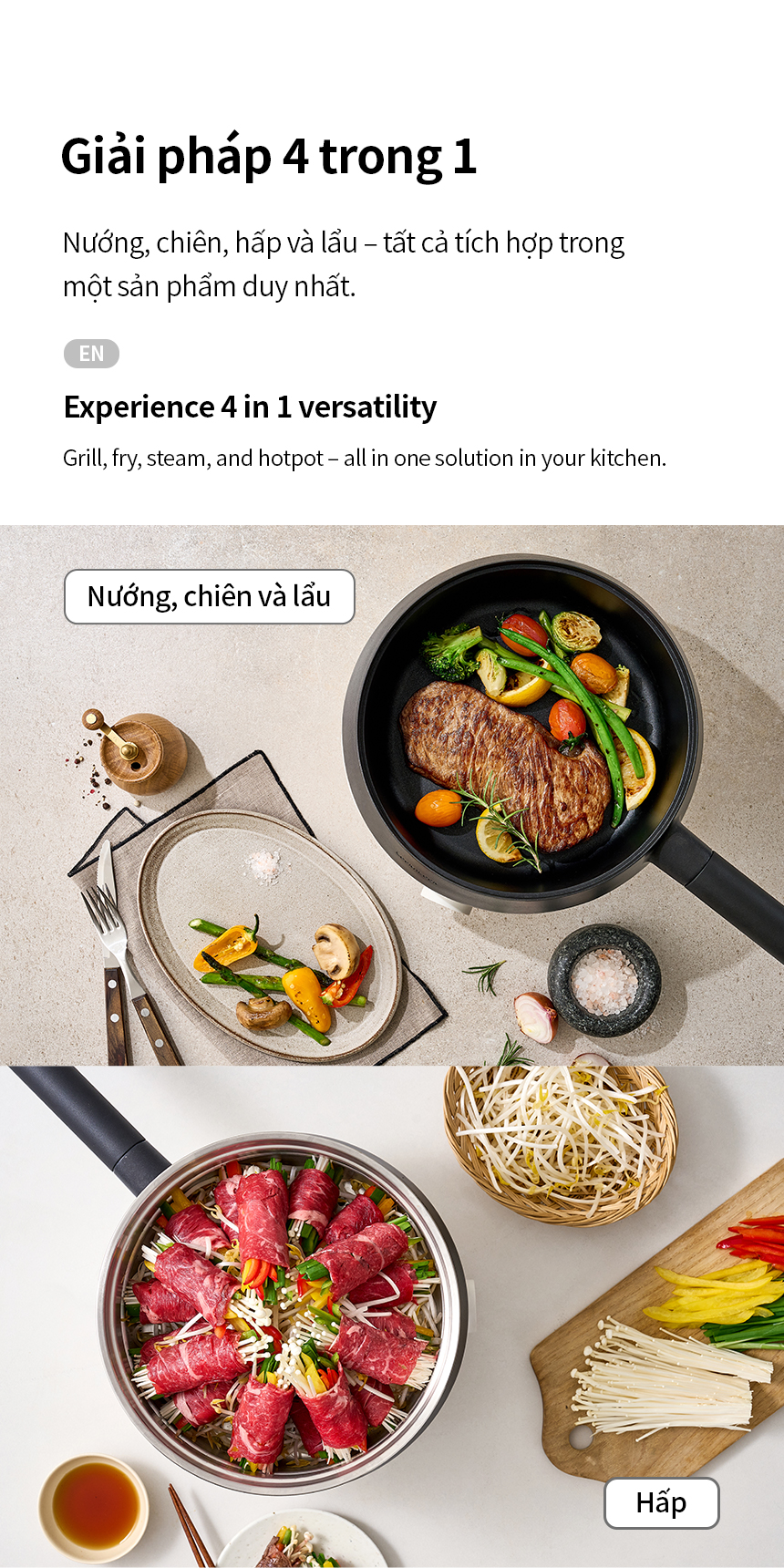 GIẢI PHÁP 4 TRONG 1: Nướng, chiên, hấp và lẩu – tất cả tích hợp trong một sản phẩm duy nhất.