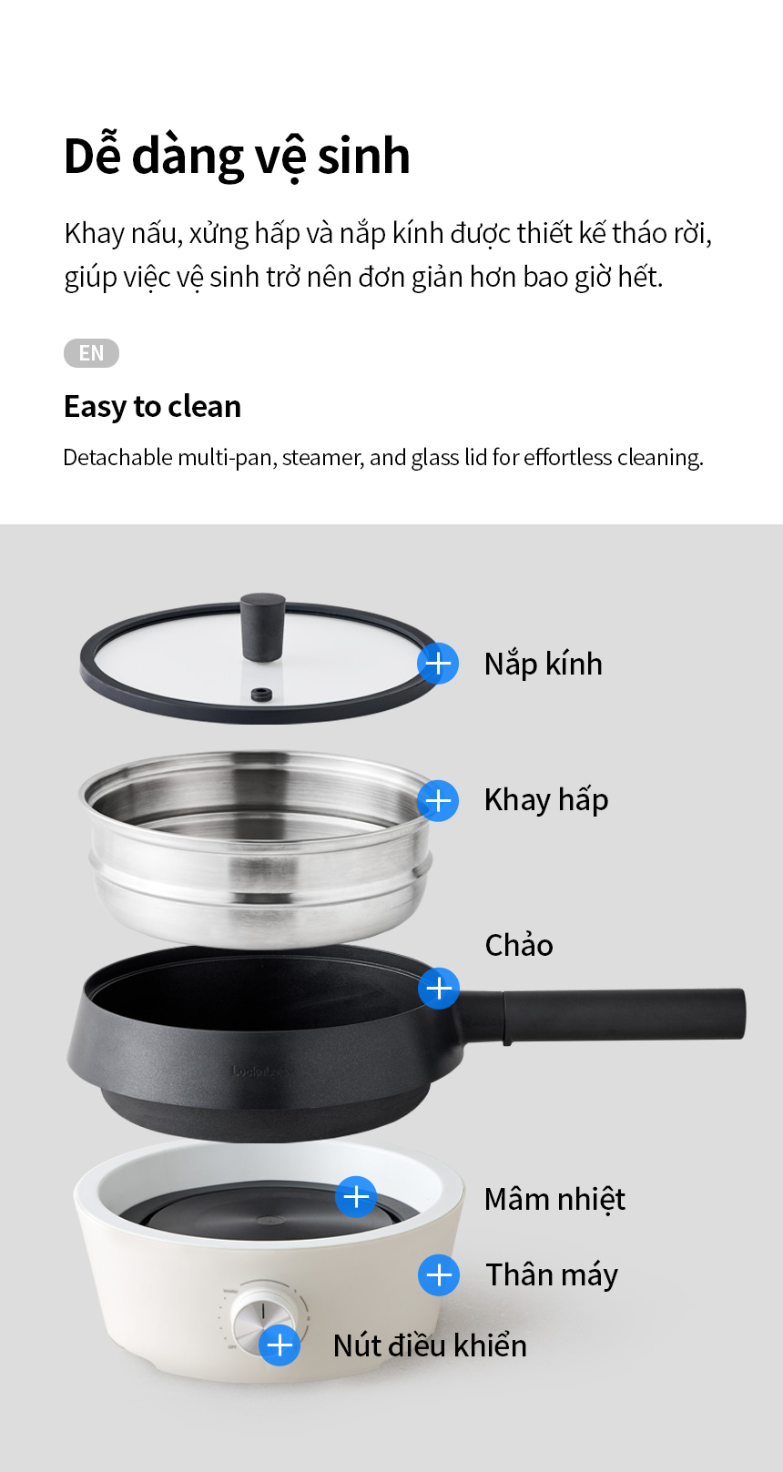 DỄ DÀNG VỆ SINH: Khay nấu, xửng hấp và nắp kính được thiết kế tháo rời, giúp việc vệ sinh trở nên đơn giản hơn bao giờ hết.