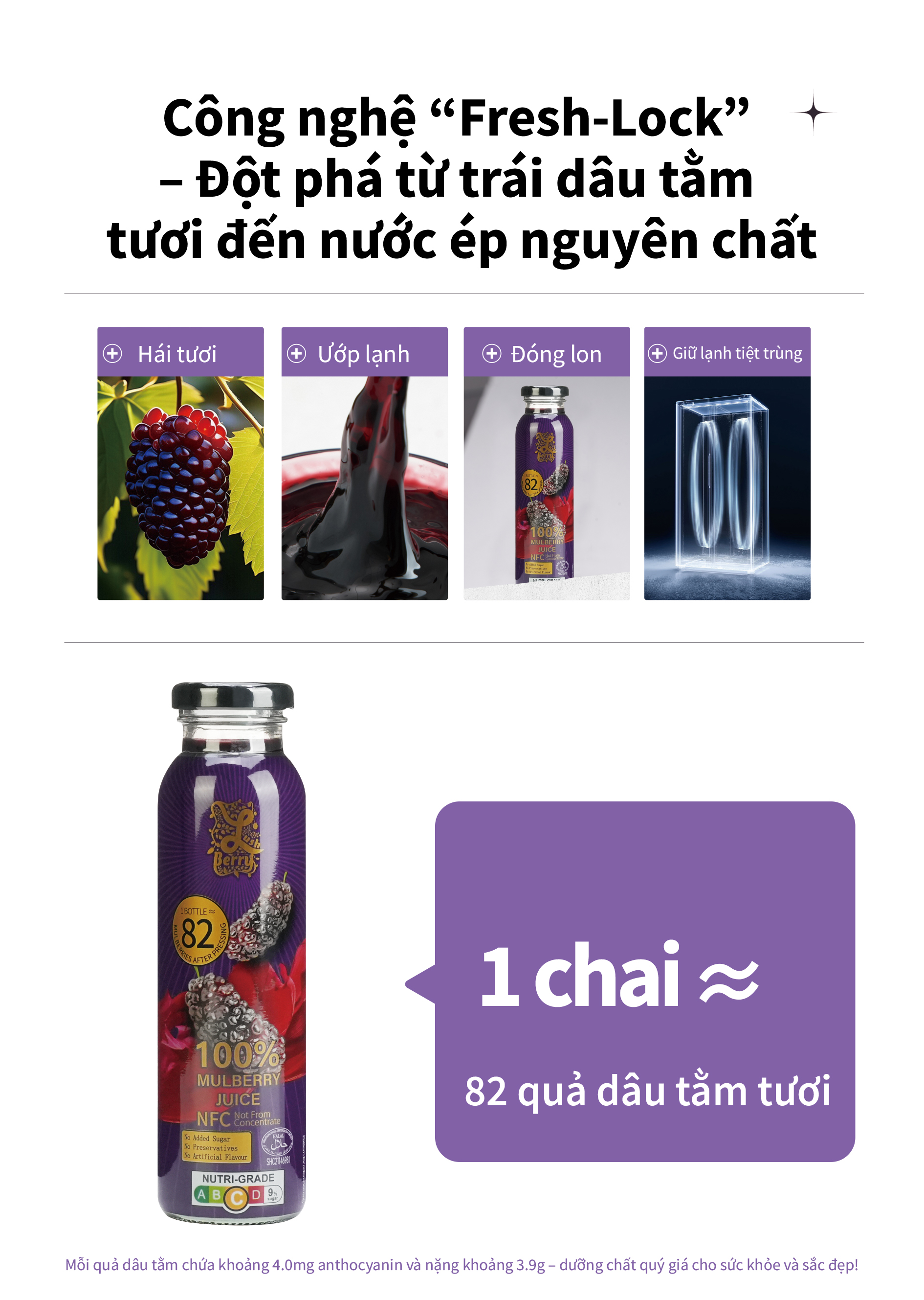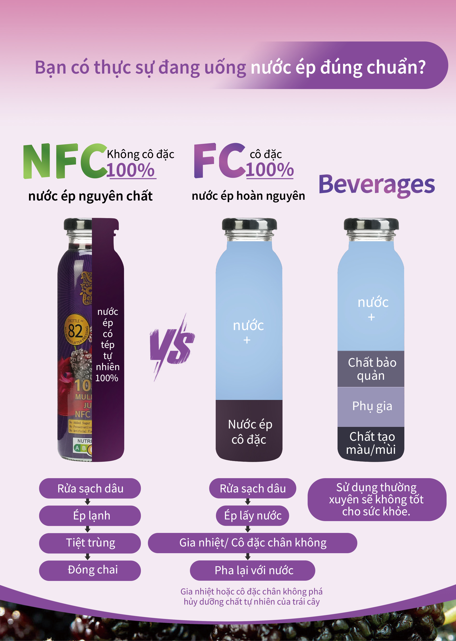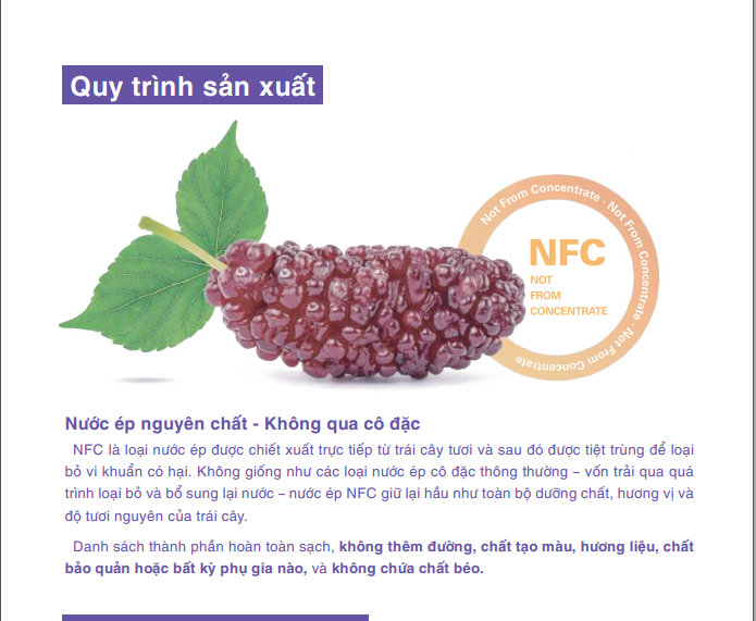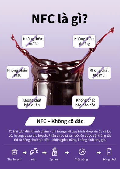 NFC là loại nước ép được chiết xuất trực tiếp từ trái cây tươi và sau đó được tiệt trùng để loại bỏ vi khuẩn có hại. Không giống như các loại nước ép cô đặc thông thường – vốn trải qua quá trình loại bỏ và bổ sung lại nước – nước ép NFC giữ lại hầu như toàn bộ dưỡng chất, hương vị và độ tươi nguyên của trái cây.