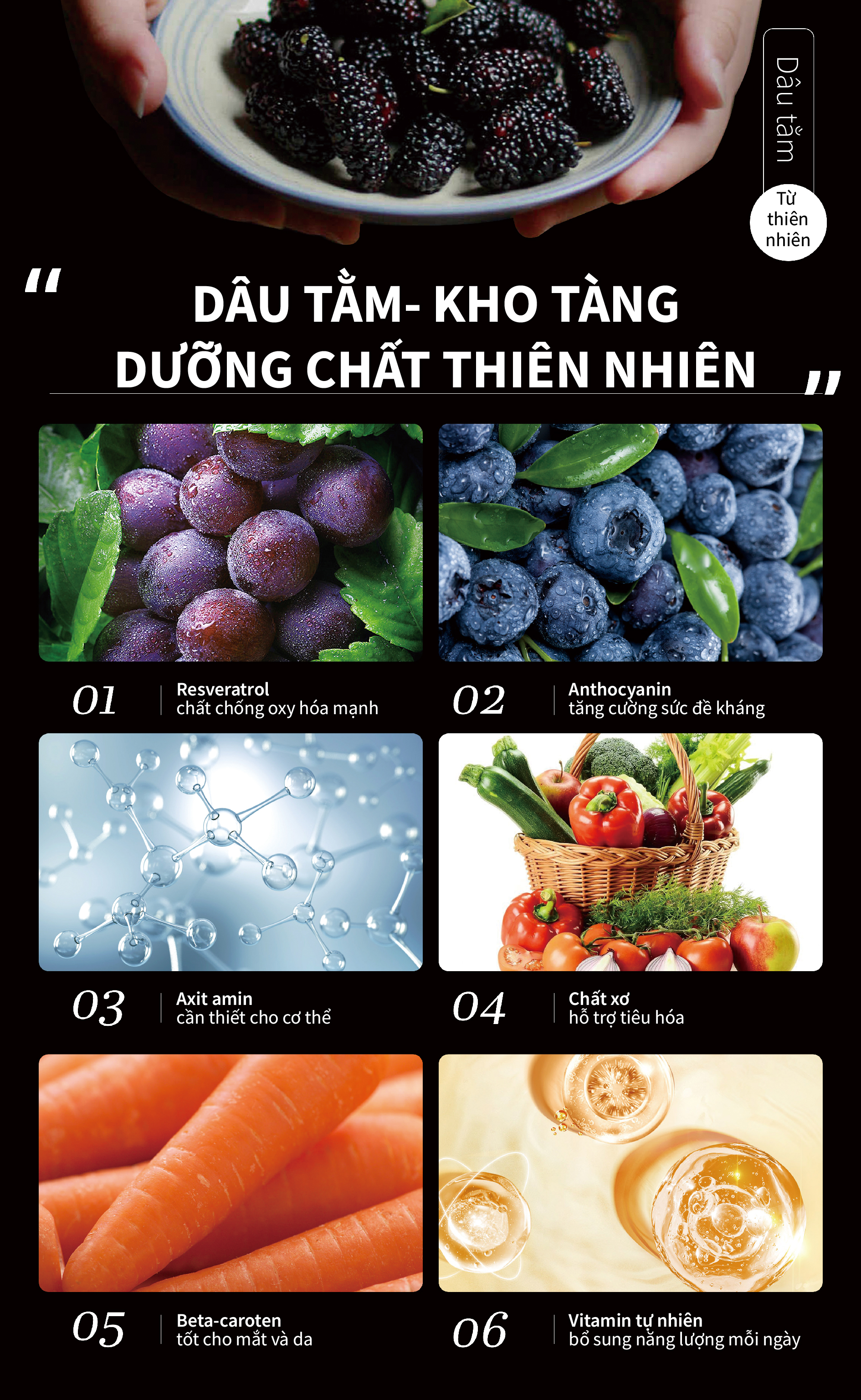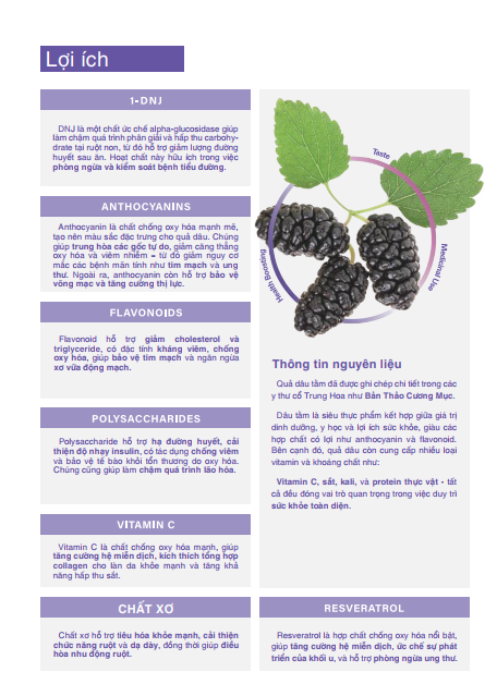 Dâu tằm là siêu thực phẩm kết hợp giữa giá trị dinh dưỡng, y học và lợi ích sức khỏe, giàu các hợp chất có lợi như anthocyanin và flavonoid. Bên cạnh đó, quả dâu còn cung cấp nhiều loại vitamin và khoáng chất như: