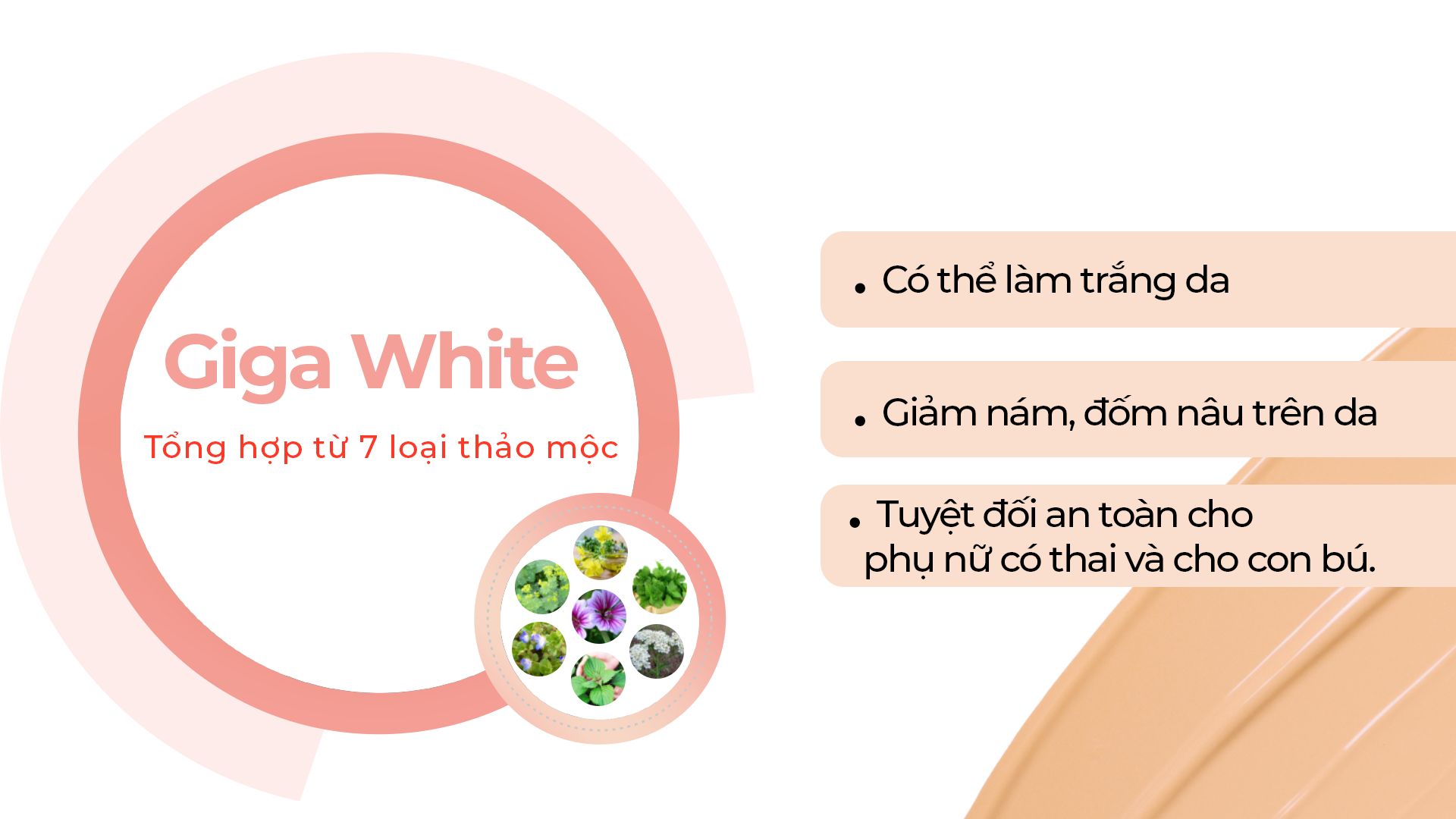 Bên cạnh đó, hoạt chất Giga White được tổng hợp từ 7 loại thảo mộc tự nhiên tốt nhất trên dãy núi An-pơ của Thụy Sĩ rất quý hiếm, thậm chí một số loài không có tên tiếng Việt, bao gồm: Chiết xuất cây cẩm quỳ, Mentha, chiết xuất lá bạc hà, chiết xuất hoa anh thảo, Alchemilla Vulgaris Extract, Veronica Officinalis, chiết xuất cây huyền sâm, Melissa Officinalis Leaf Extract, và chiết xuất cỏ thi. Giga White có thể làm trắng da và giảm nám, đốm nâu trên da tuyệt đối an toàn cho phụ nữ có thai và cho con bú.