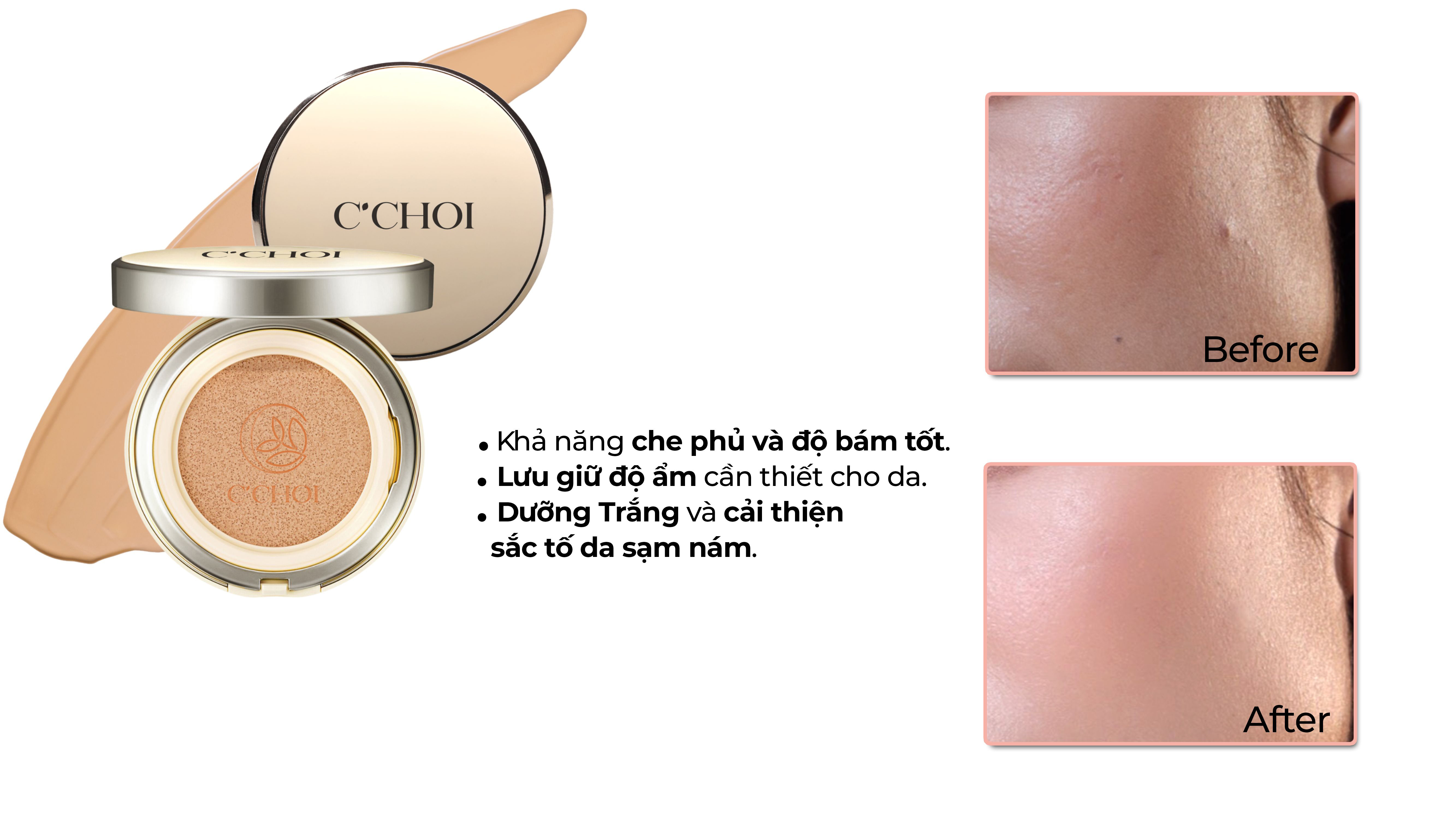 Ngoài ra, C'Choi Herbal DD Cushion chứa thành phần Amitose R dẫn xuất từ Amino Acid giúp nâng cao khả năng dưỡng ẩm để hỗ trợ làm chậm quá trình lão hoá da, đồng thời cân bằng hệ vi sinh có lợi cho da, kháng viêm và se khít lỗ chân lông.