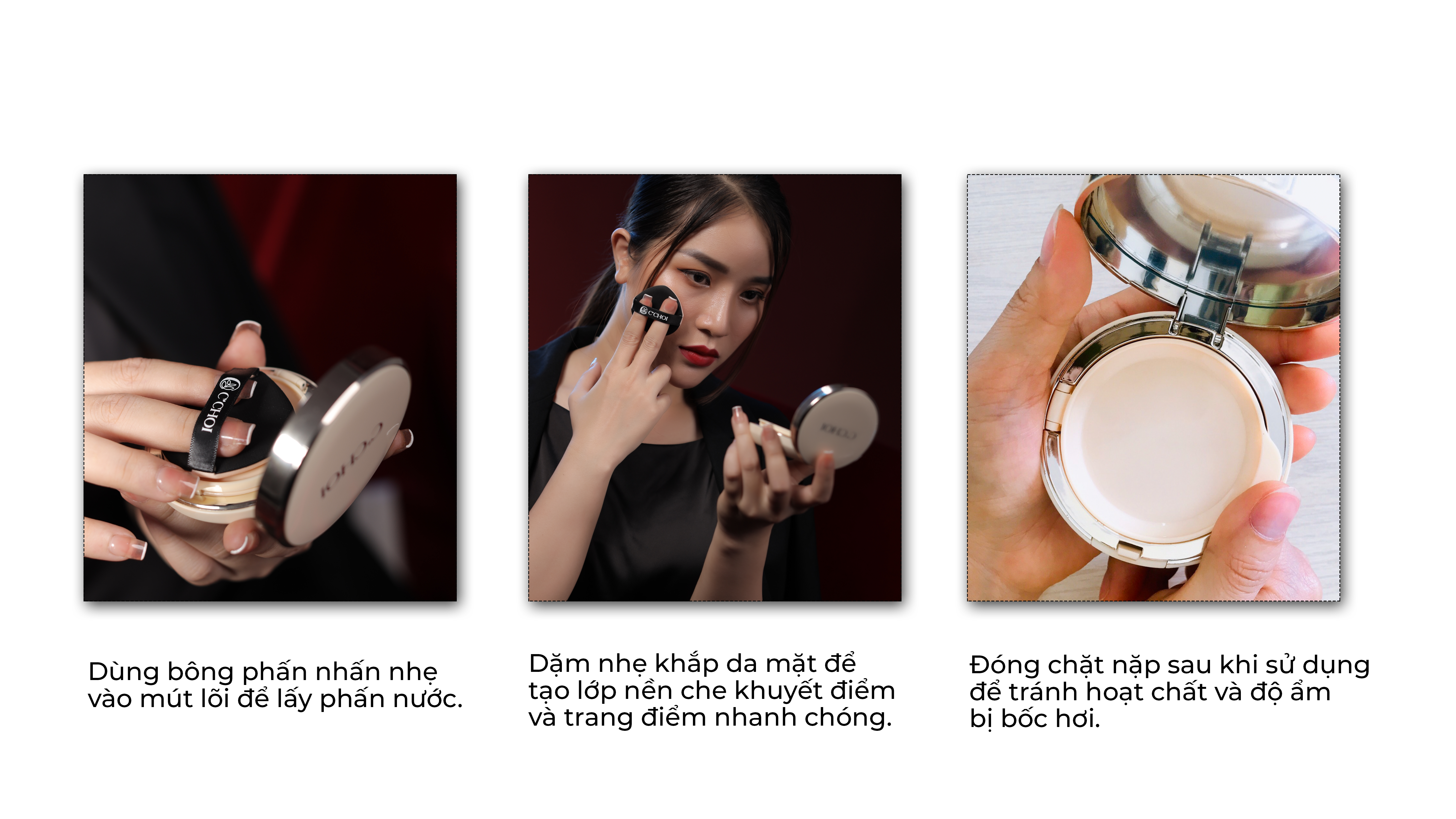 - Dùng bông phấn nhấn nhẹ vào mút lõi để lấy phấn nước, dặm nhẹ khắp da mặt để tạo lớp nền che khuyết điểm và trang điểm nhanh chóng, dễ dàng.