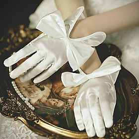 Găng tay satin màu trắng đính nơ cho Cô dâu và Dạ hội, đi tiệc, sự kiện, đạo cụ cosplay, chụp ảnh, studio MS: 44935