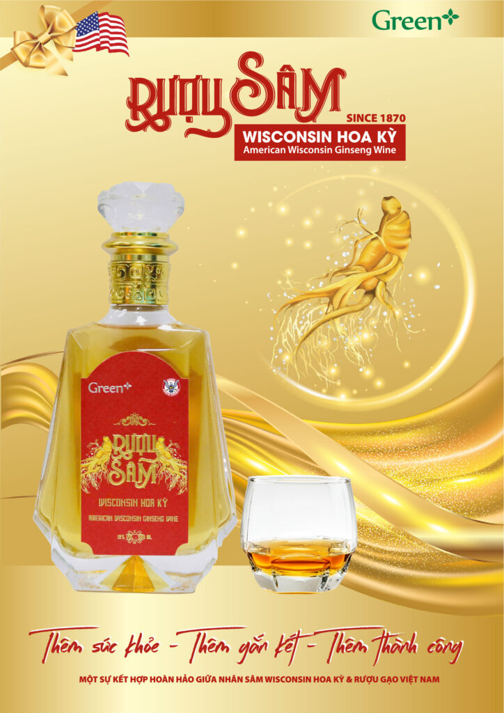 Rượu gạo truyền thống của Việt Nam sau khi được loại bỏ Aldehyde và Methanol sẽ được ngâm ủ với nhân sâm Wisconsin Hoa Kỳ 4 năm tuổi.