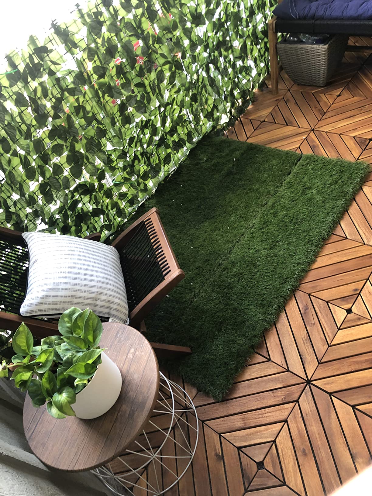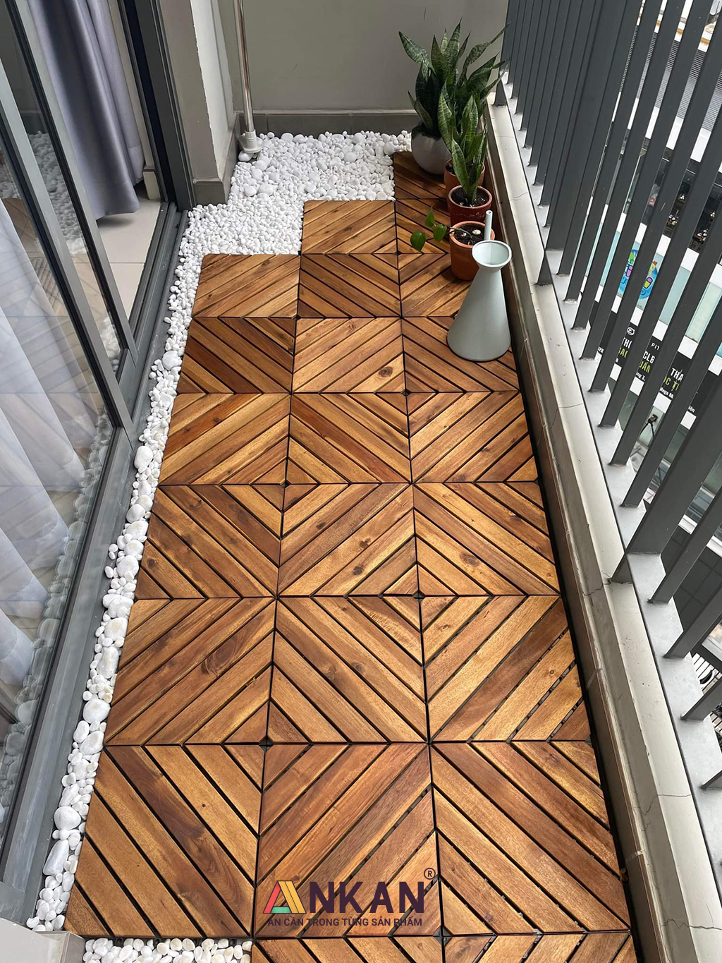Sàn gỗ lót ban công 8 nan xéo là một trong những kiểu vỉ gỗ độc đáo nhất trongh ngành. Khi lắp 4 vỉ cùng mới nhau sẽ giúp nơi lót trở nên vô cùng đẹp!