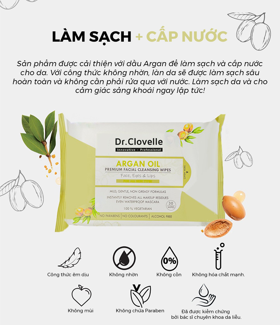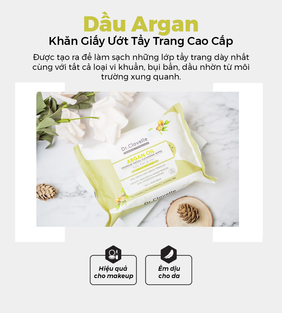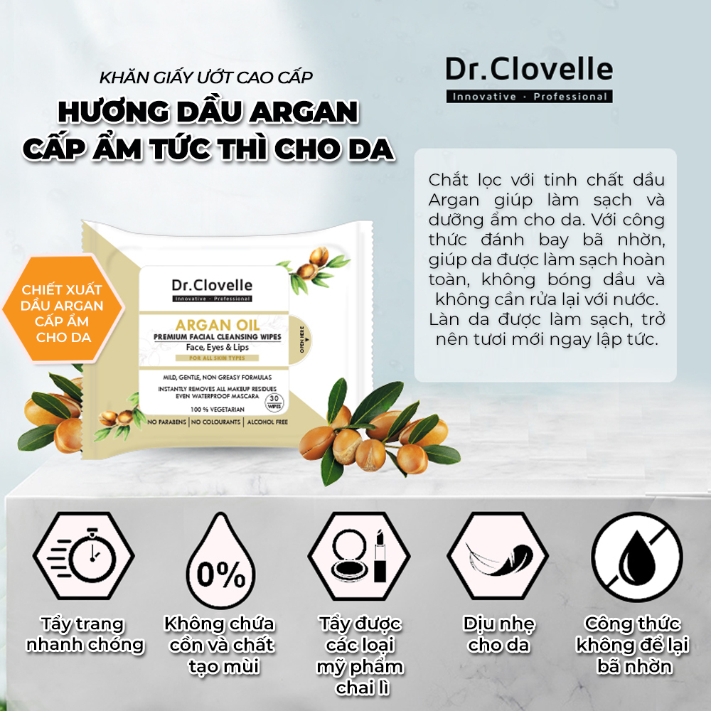Khăn giấy ướt cao cấp Dr Clovelle cấp ẩm tức thì cho da, không bã nhờn, tẩy trang hiệu quả, hương dầu Argan thơm mát (30 tờ/gói)