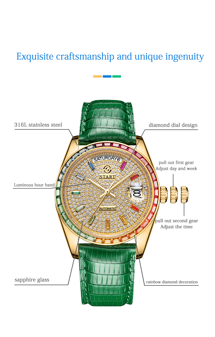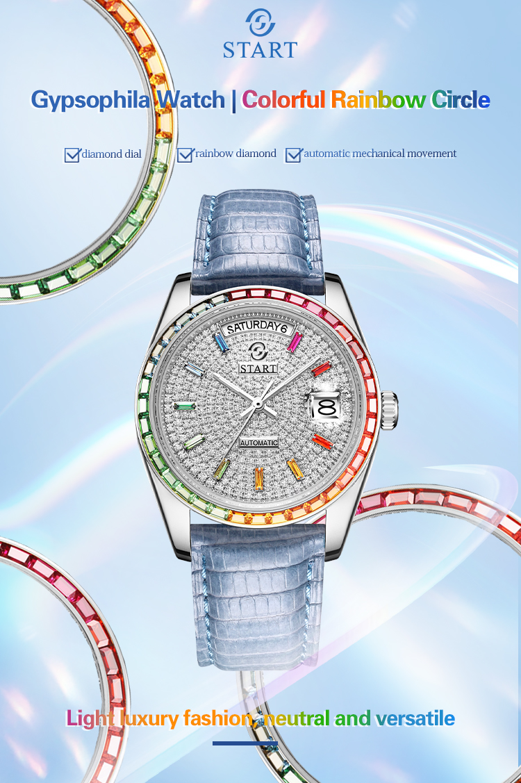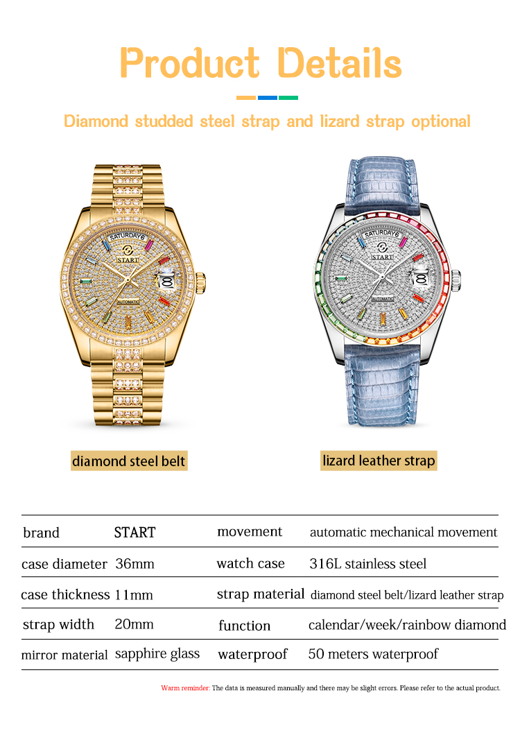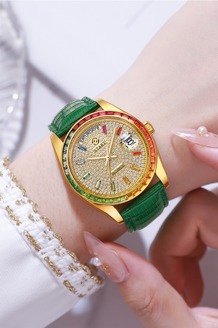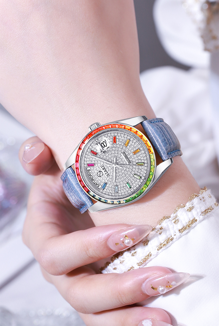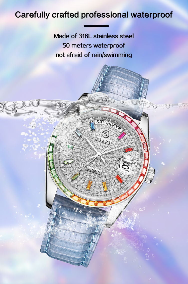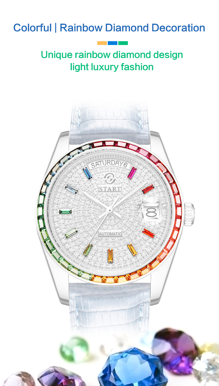 【sản phẩm mới】Đồng hồ kim cương cầu vồng Đồng hồ nam nữ Đồng hồ cơ tự động Kích thước unisex 36MM dây da thằn lằn chống nước chức năng hiển thị thứ ngày
