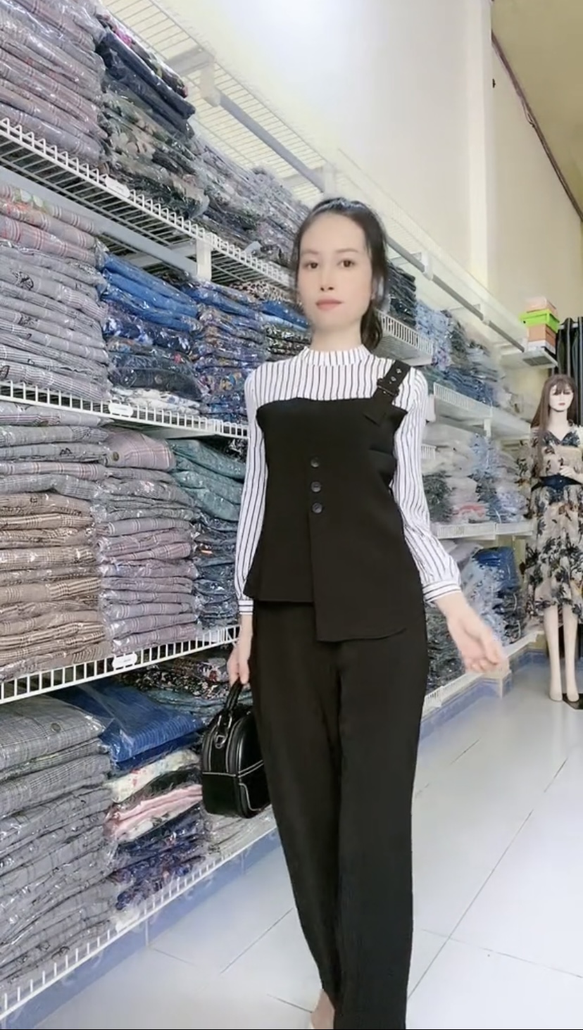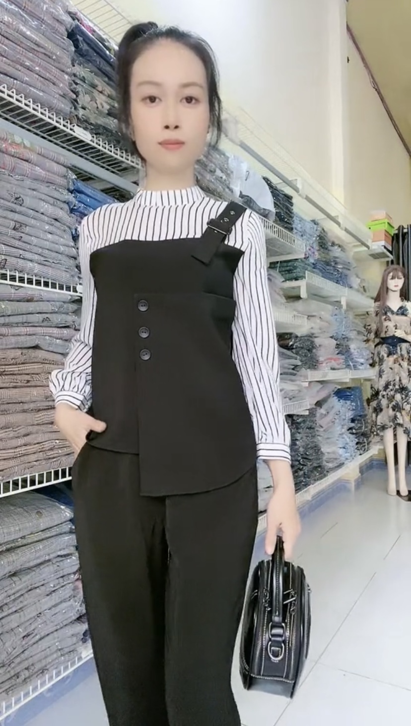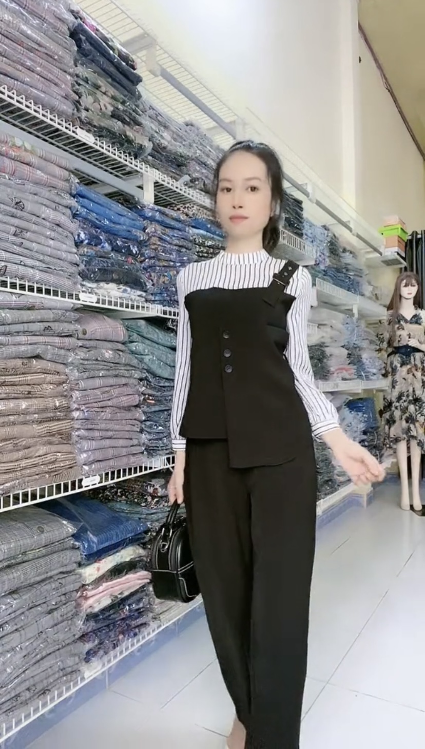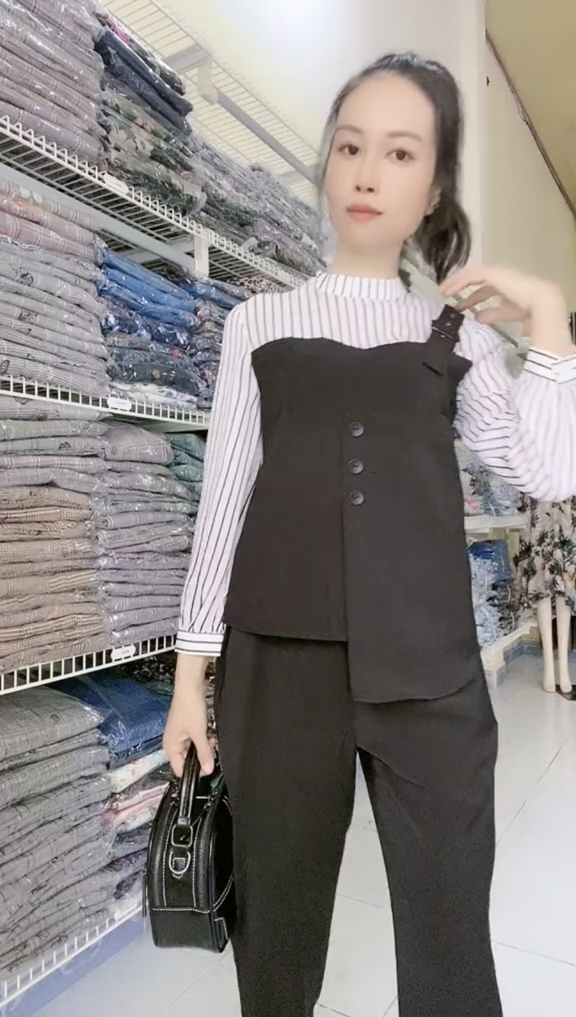 Set áo sơ mi yếm sọc một dây kèm quần ống đứng trẻ trung.
